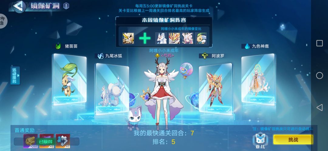 镜像矿洞除首周系统固定外,往后每周阵容随上周玩家挑战第一名阵容变化,本周镜像矿洞阵容为:boss(火系)、阿波罗、狐狸、小鹿女、猪总,接下来我说一下我的打法.