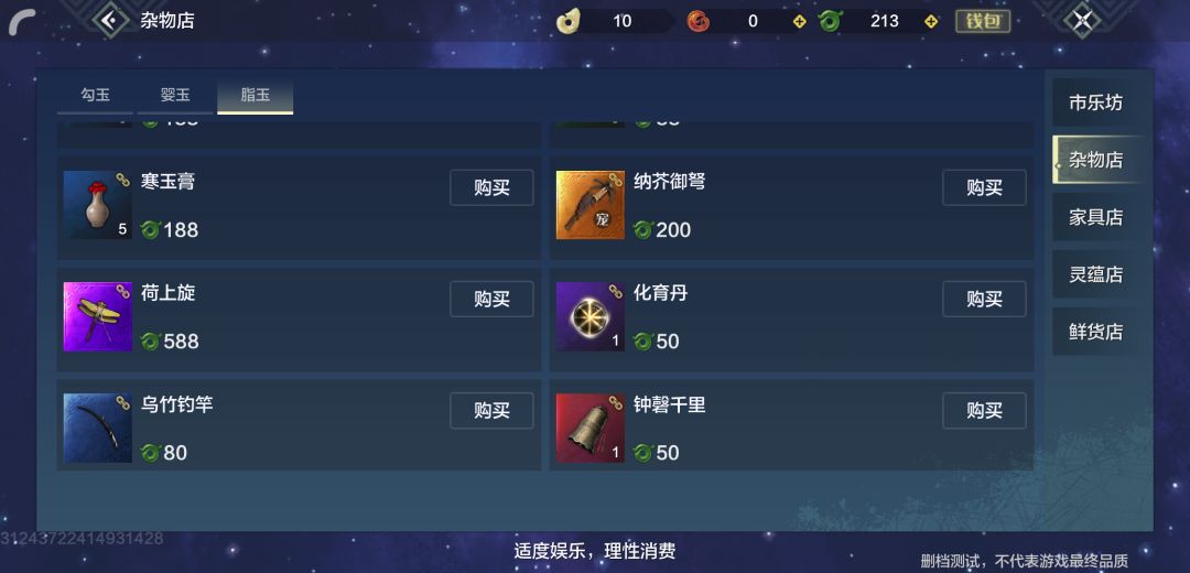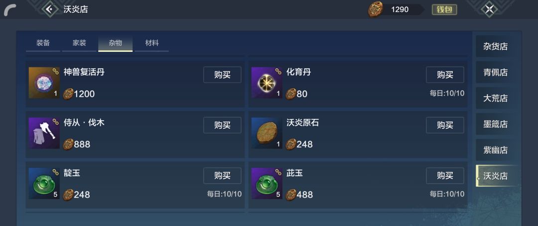 貔貅台不但可以购买技能书,还可以购买巨兽材料,家具,图谱,装备。杂货店还可以购买归原符,归原符作用就是你在接受了小队——秘宝符时不喜欢该任务可以删除此任务(任务奖励最终看你队伍人数而定,如果接取时四个人,领奖励时只有两个人只按两个人算)完成小队符之后会获取青佩币和贝币,青佩币可以换各种宝贝,这里不多多介绍了。(貔貅台可以通过息壤解锁科技制作)