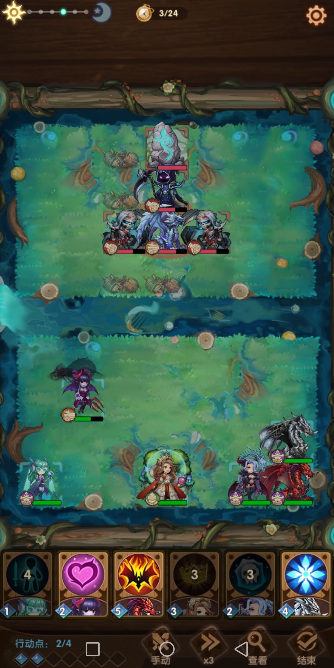 敌方第二回合,抛尸车集火冰龙,亡灵术师大概率在左侧身旁召唤骷颅,骷颅前进。我方第二回合,冰霜魔女大招给冰龙,冰龙发起爱的呼唤,被集火砍成半血,加费,魅魔魅惑骷颅堵塞中路,魅魔拉到战场右边界脱离冰阵范围。