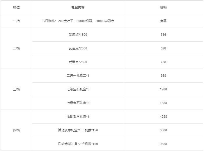 *【活动武学礼盒】:打开后可在断弦三刀、电光一字剑、劈空掌、暴雨梨花针、乘风蹈海、春阳融雪功、250千机券中选择一个获得。