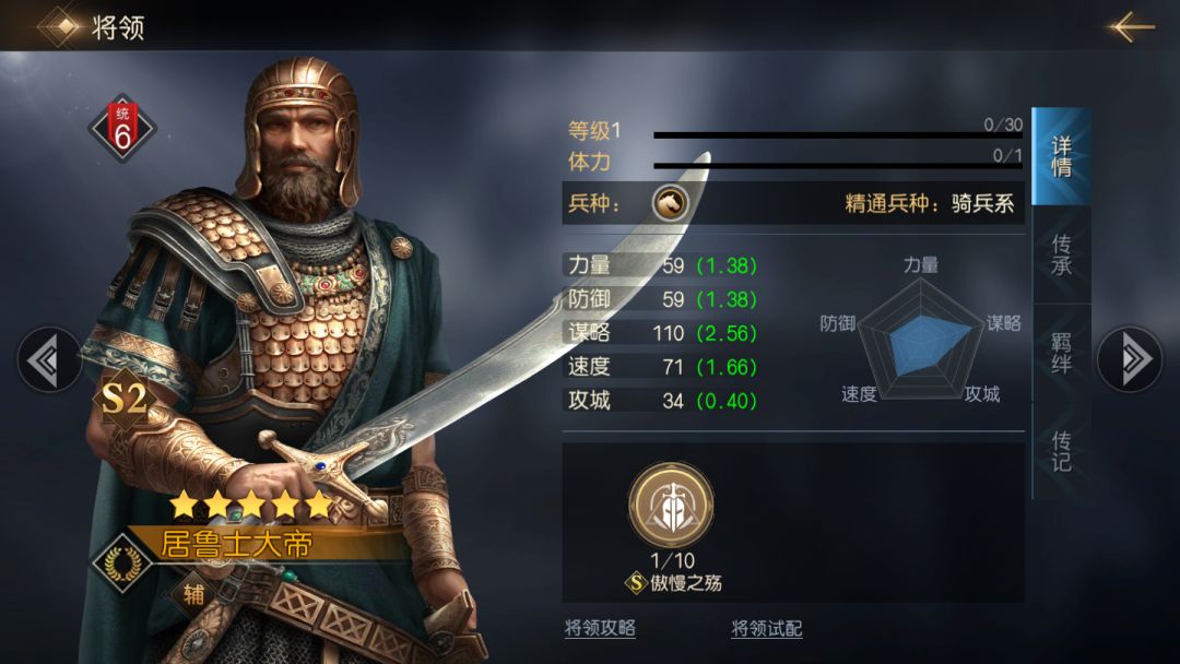 居鲁士大帝的五维属性在五星武将中属于中等水平的存在,但面板中谋略成长属性达到2.56,速度也有1.66的水平,作为一个辅助型将领,高速度能使他发动技能更快更优先,高谋略能让他造成不错的伤害输出,配合自带技能的效果来看,会是一个不错的战斗型辅助角色。