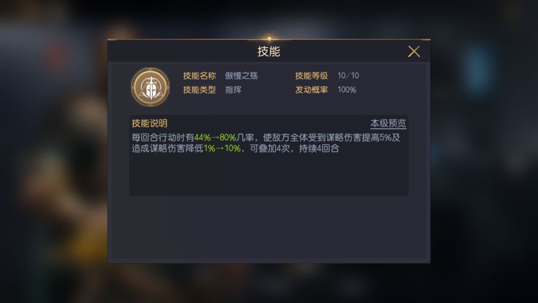 技能介绍:属于指挥技能,开局百分百几率发动。能让他每回合行动时都有极大的几率使敌方全体受到谋略伤害提高,并且使得他们造成谋略伤害降低(随着技能等级的提升,这个降低的百分比也会提高),可叠加4次,持续4回合。提高敌方全体受到的谋略伤害,相当于变相提升了我方所有谋略类将领的输出伤害,这个辅助增益效果非常明显,后续的减益效果也很克制谋略将领,在两个状态叠加满后的回报收益非常高。