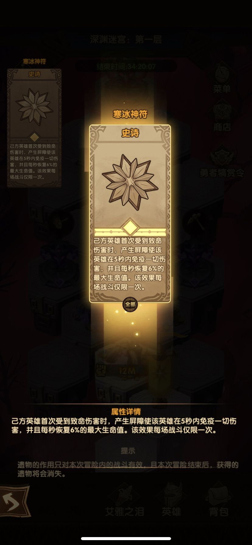 寒冰神符:首次受到致命伤害时产生屏障使该英雄在5秒内免疫一切伤害。