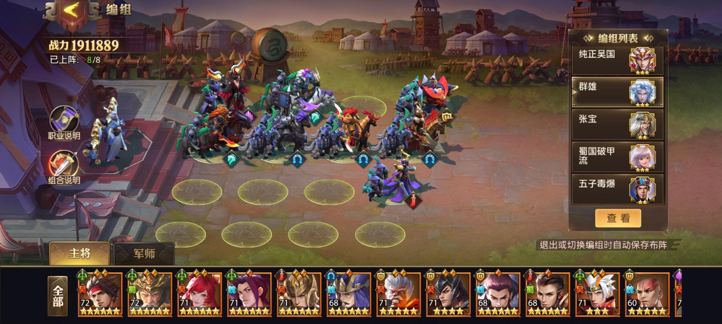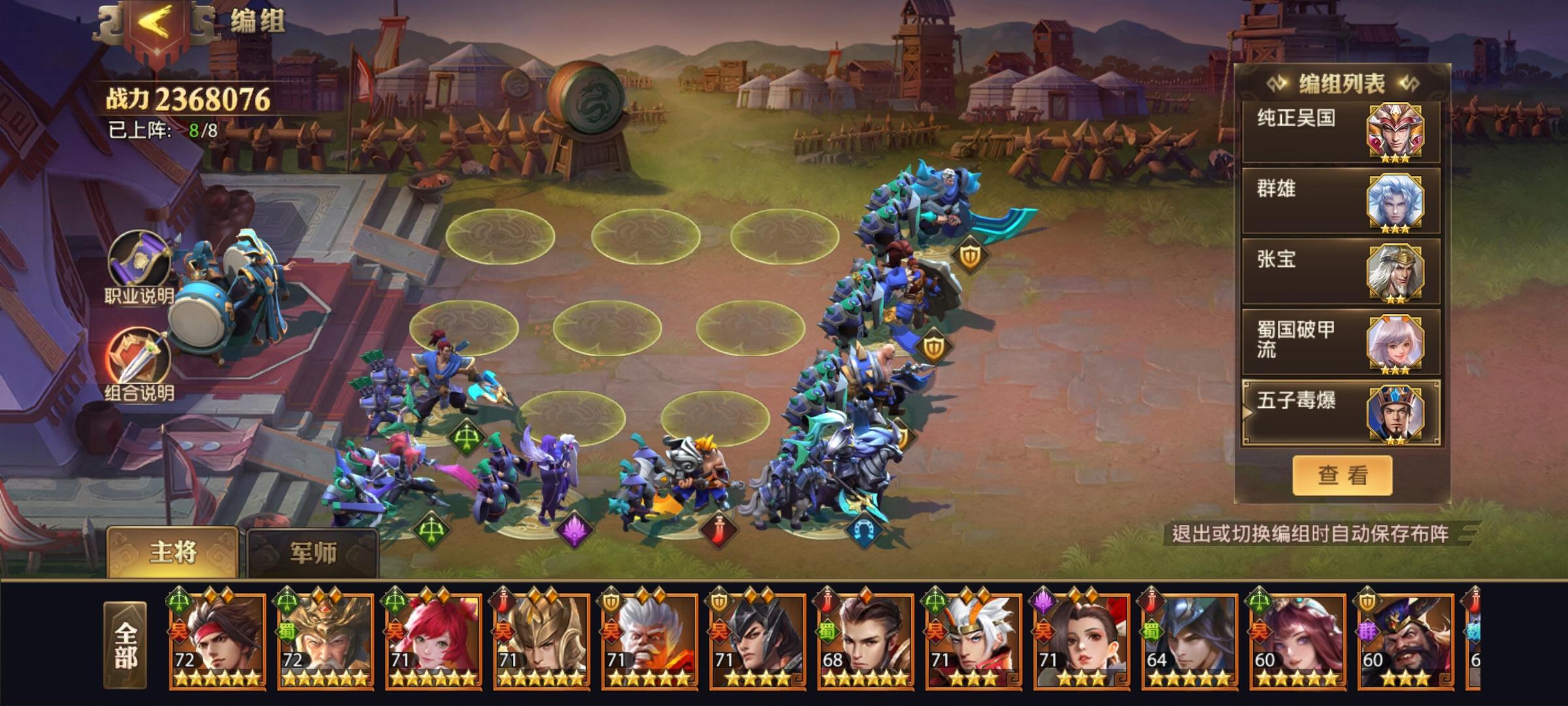 (这不是标准的毒爆,只是为了打魔将,最大化利用资源并且避免重复,没有贾诩依旧是替换,可以加个弓手,五子加士兵数量以最大化伤害)