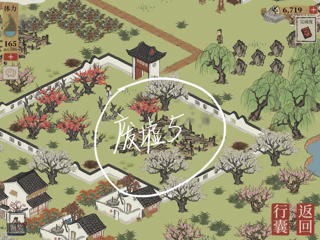 提醒:本章节有很多种桃树的地方,所以多囤一些桃花树苗和井水!!!种下的桃花成熟之后就可以收取桃花泪了。桃花坞废墟周围的桃树坑栽种完之后,桃花坞废墟会变身。变身后的建筑可以领取奖励。