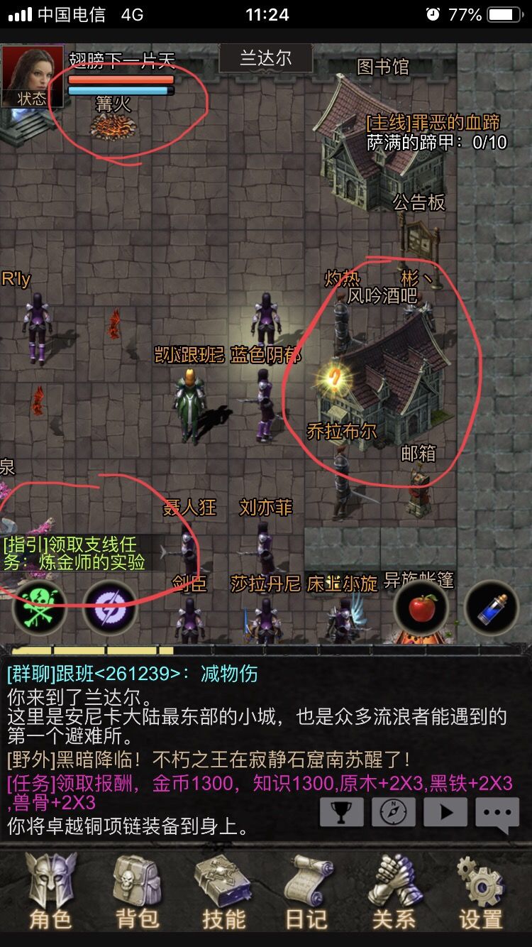 图片左上角的红圈里是篝火 在36级之前烤火取暖可以得到50的攻击跟防御 非常不错的buff 可以无限次领取 记得经常去烤火 是下幻境的好帮手之一 另一个就是异兽系统了