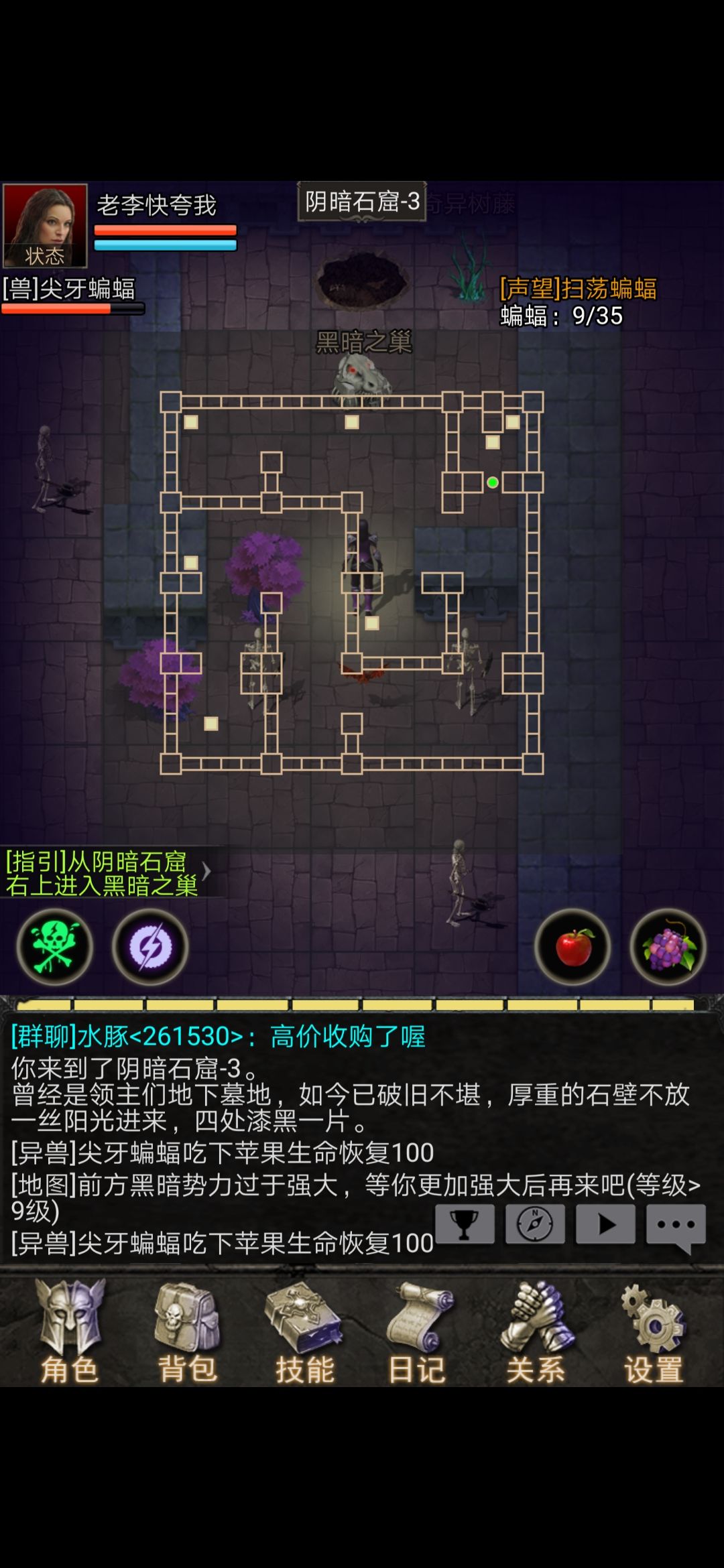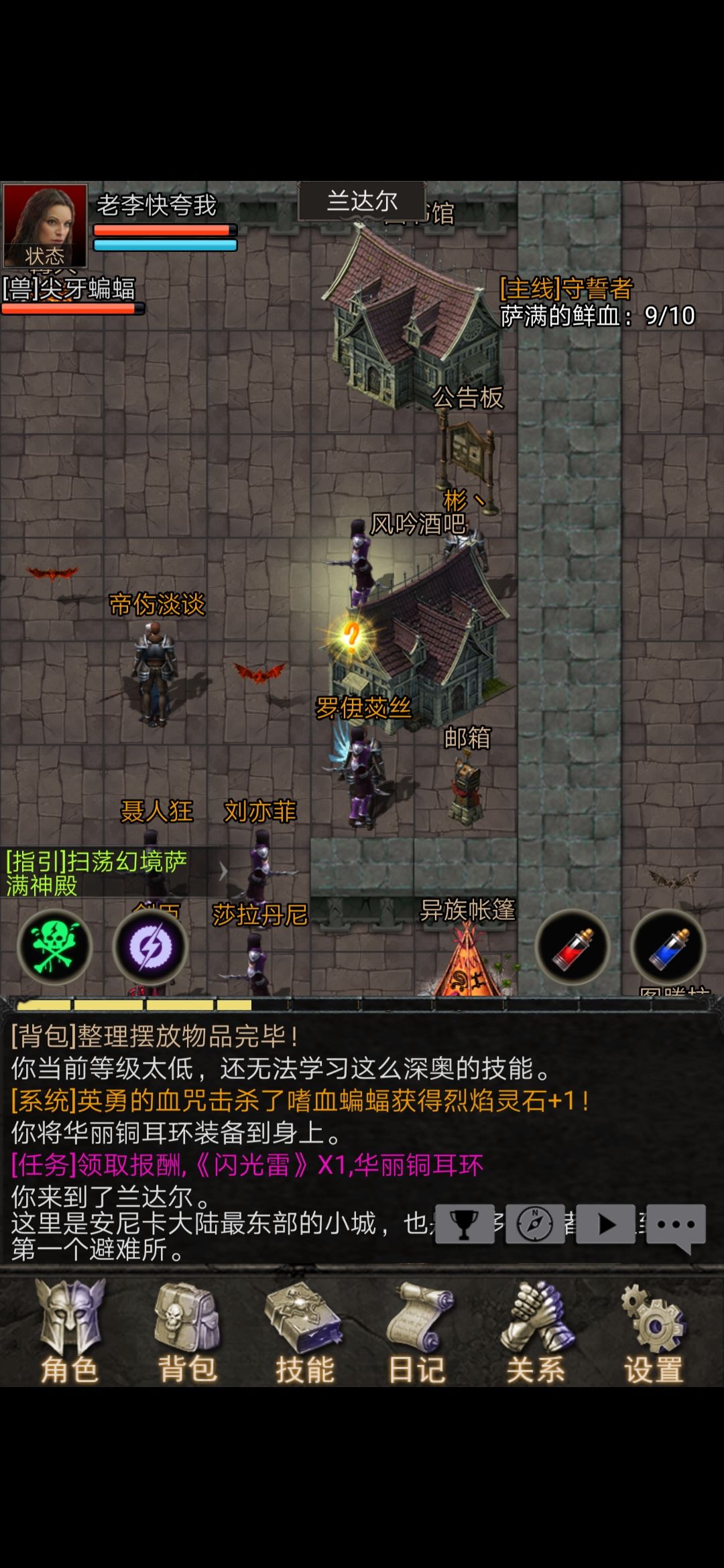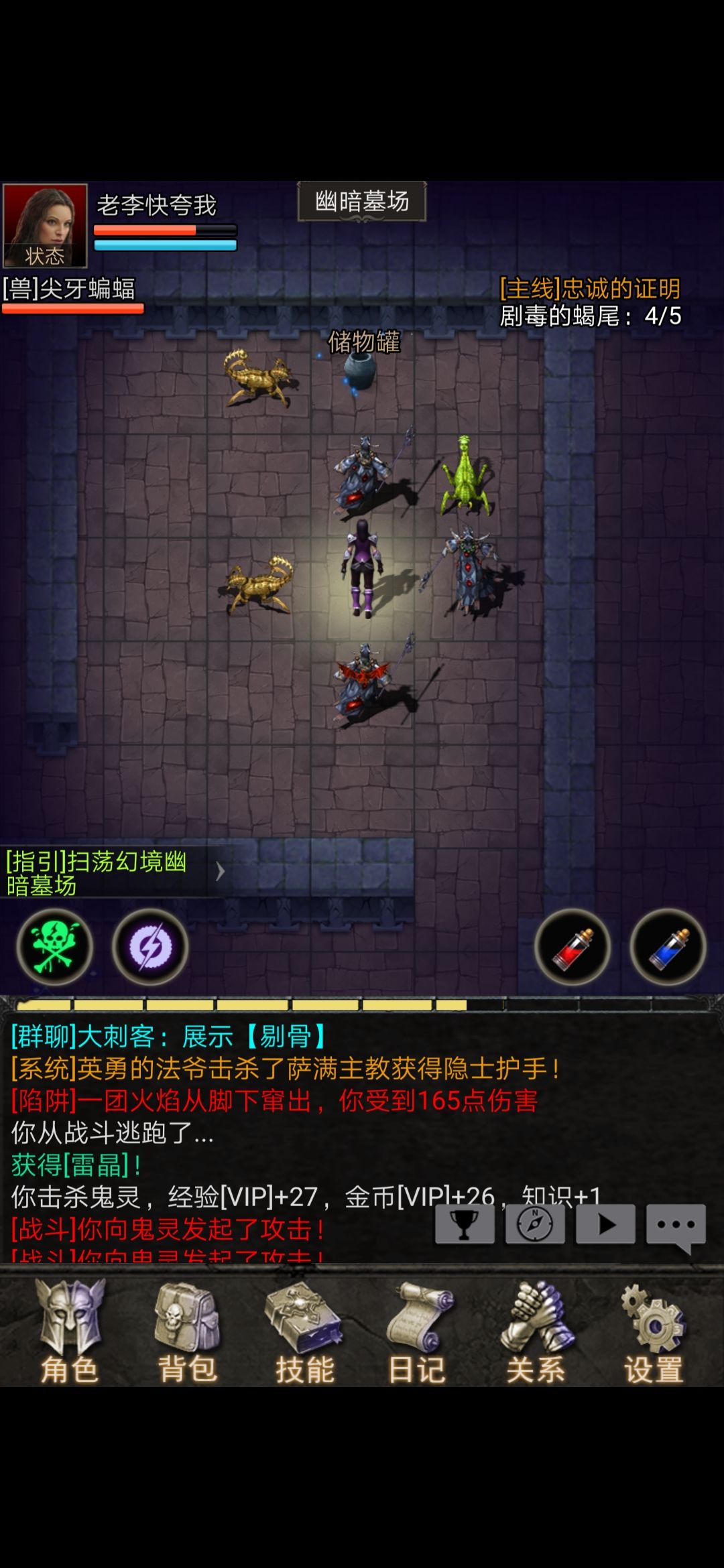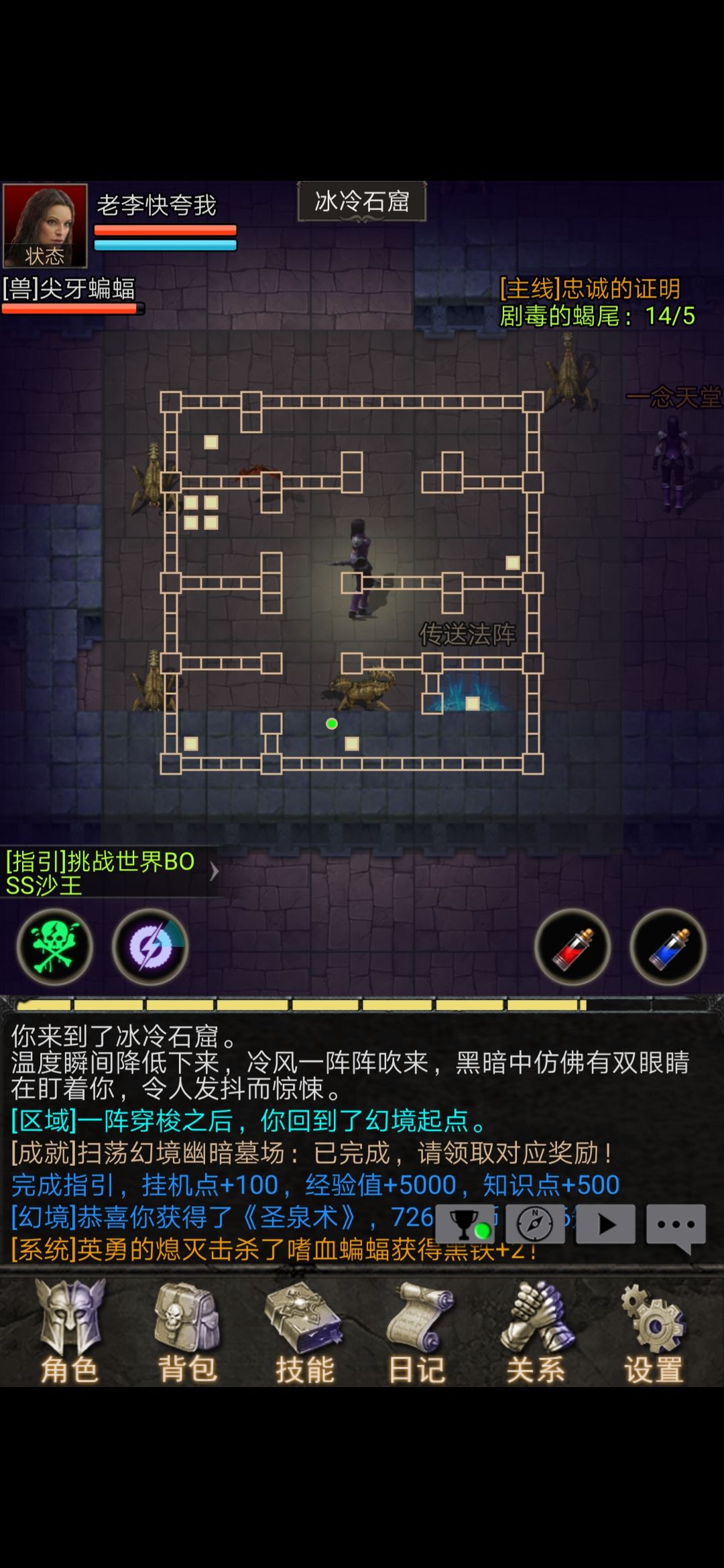 主线和指引都到萨满了,这个幻境就难度有点大了,里面的随机陷阱中两个就秒人,千万...千万...千万记得走慢点。现在先不去了,先老老实实刷墓场,挂机升级,装备差不多了再去。15级群攻技能到手,现在等级还不够,先存起来。