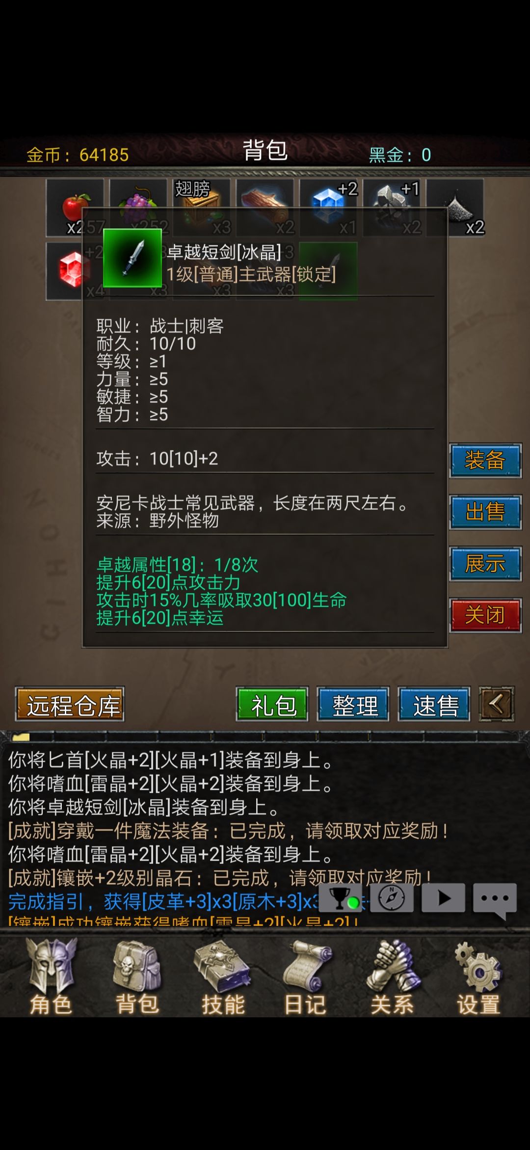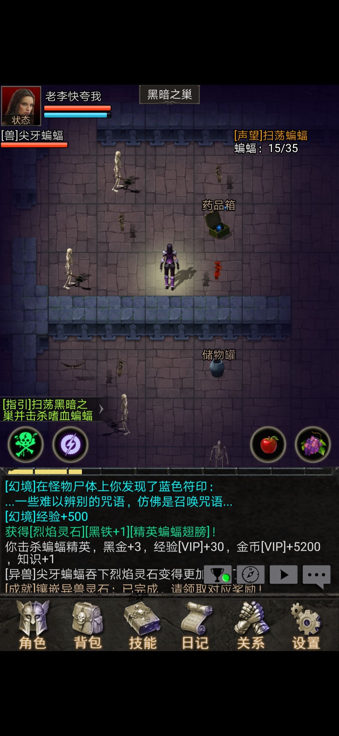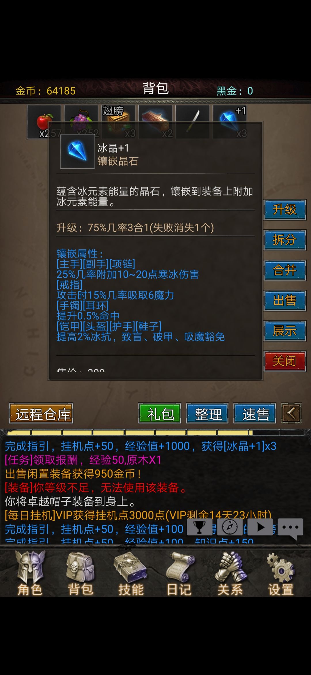 最后再简单说几句,这游戏本质玩法就是平时挂机刷门票,有时间手动刷幻境和野外boss,前期的三个boss骷髅王、沙王和灰烬都直接掉遗迹装备(普通、魔法、遗迹是装备的三个级别,遗迹的最好)。后面的包括幻境boss都是掉碎片,需要合成。玩法和设定都是我很喜欢的类型,以后吧,有时间出个研究人物加点和属性关系的帖子,还有宠物属性的研究等等,今天先带大家简单熟悉一下。