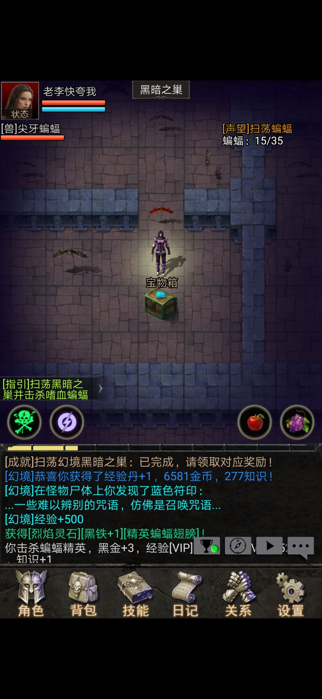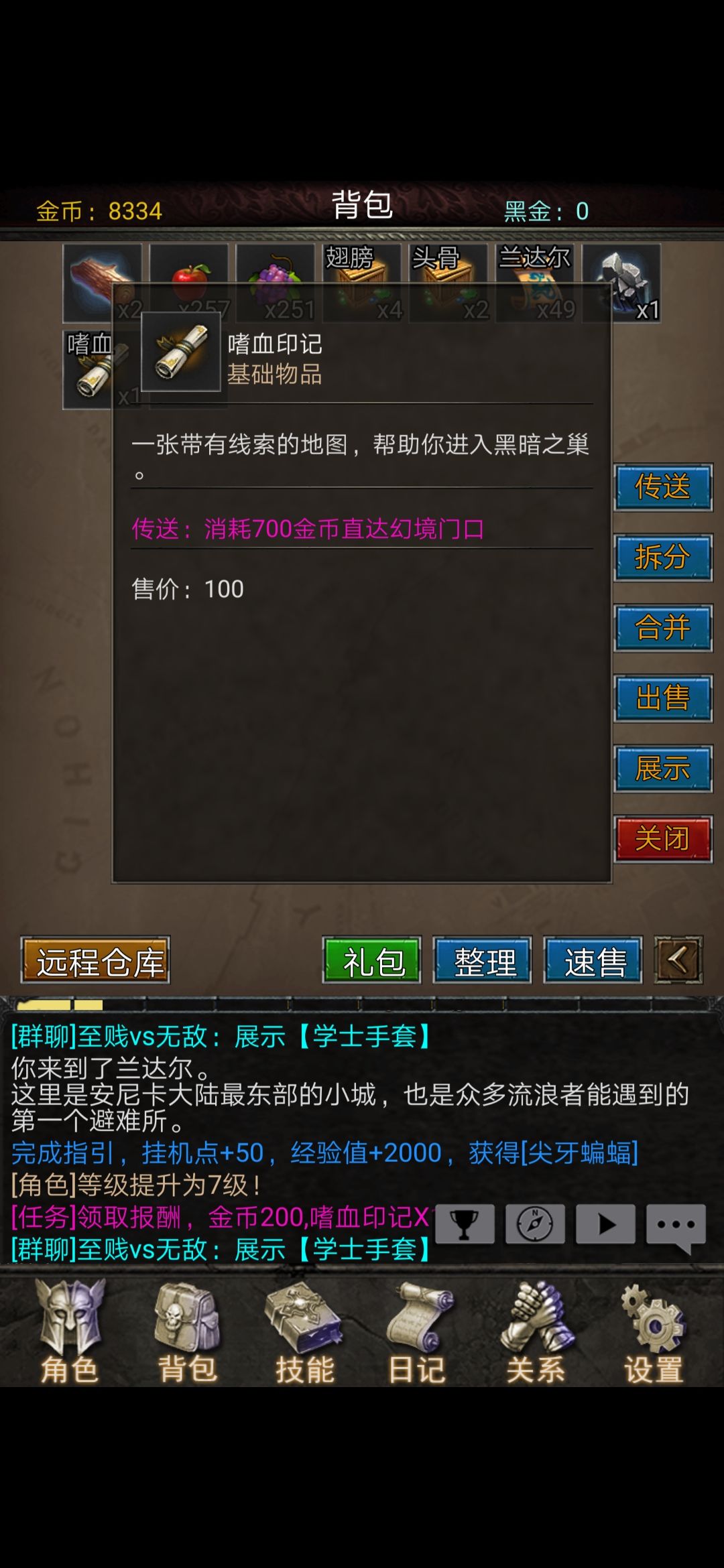 嗜血印记,就是最低级幻境的门票,可以直接传送过去,这个传送功能在熟悉地图以后可以省点路,别心疼金币,多的花不完。任务分3种,主线不用说了,幻境任务对应不同级别幻境的门票换取,20级以前可以一直换黑暗之潮的门票。还有支线任务,就是拿地图出的材料换知识和凝炼材料,循环的,老李说一天可以做200次,你有多少材料点一次就都兑换了,也就是说材料够可以直接一次完成200次的上限,记得拆分存仓库。