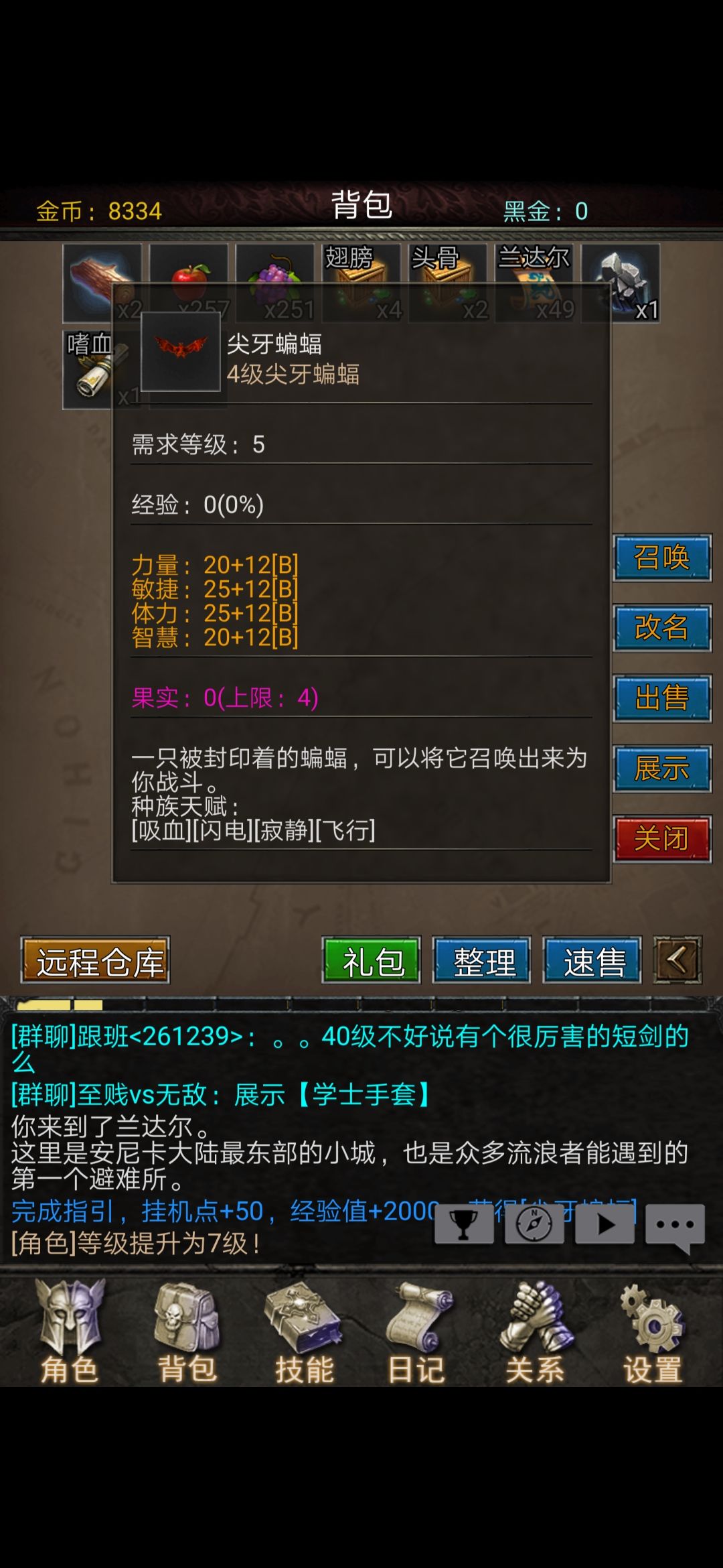 旁边不起眼的黑色蝙蝠是boss嗜血蝙蝠,运气不错,给了经验丹,嘿嘿!后面的知识是升级技能必需品,相当于技能熟练度。打怪才掉1点,低级怪甚至好几只才掉1点,还有打到的宠物是需要鉴定的,用知识,知识是好东西,SS宠物就靠他了!打完回家!对了记得买回城,虽然1000金币一个,不要心疼,金币有的是!