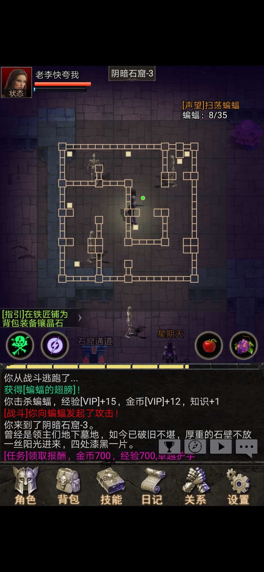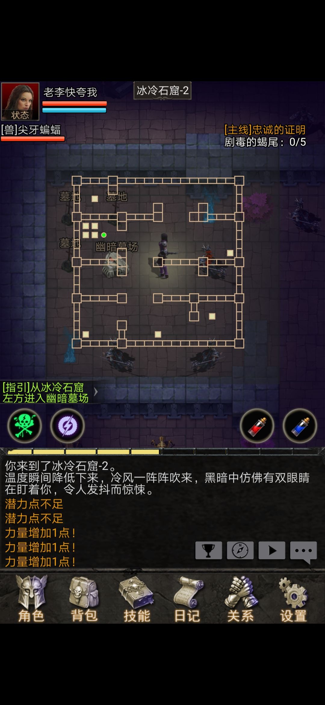 酒馆界主线任务,接了任务就要去洞窟打怪了,走之前记得点篝火取暖,加50攻防半小时,提升效率!