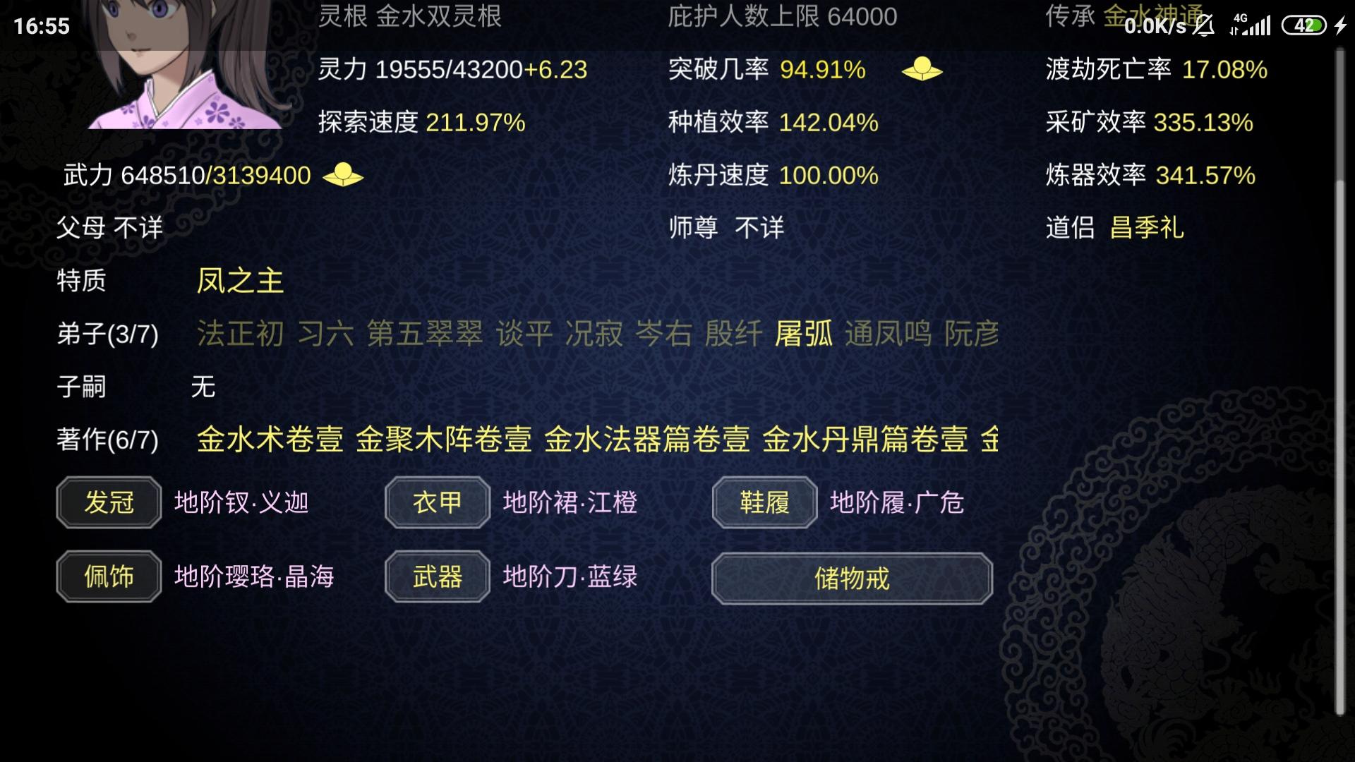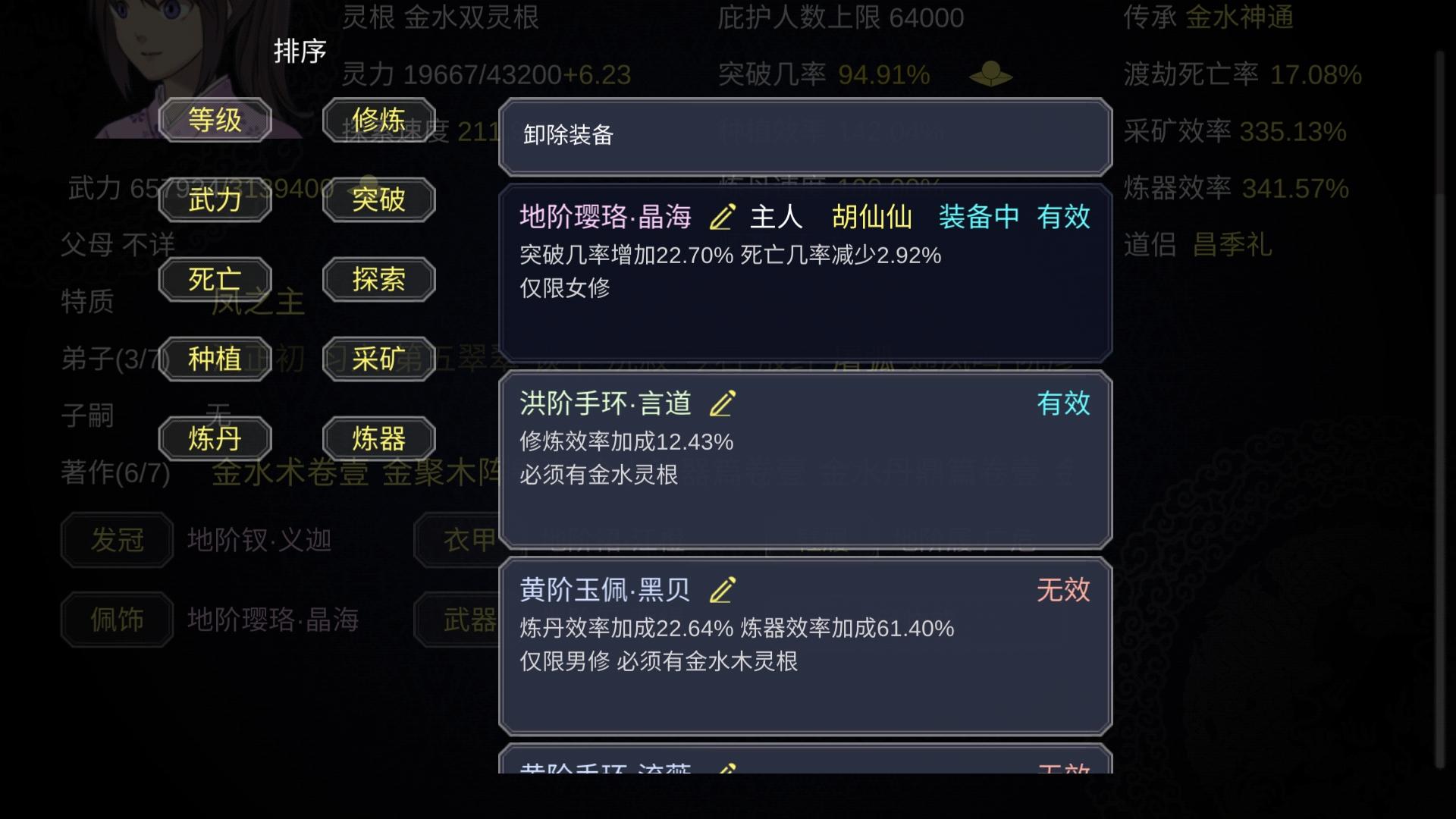 )穿上,如此反复,都不用生产装备了,而且装备还加突破成功概率,降低低死亡概率啥的,所以我不用丹药也可以苟到晋