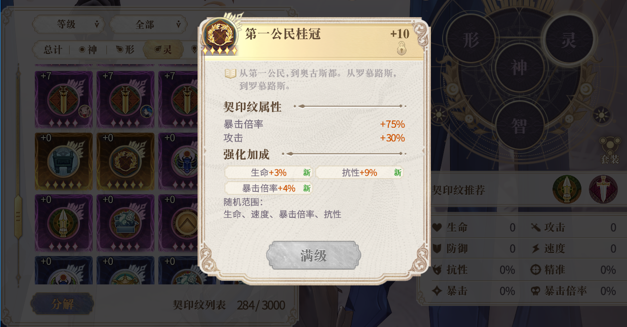每个契印纹都分为基础属性和附加属性,基础属性在获得契印纹时就已存在,3星以上的契印纹都有两条基础属性。灵之位的基础属性词条只会出现攻击、防御、生命、暴击和暴击倍率,其中暴击和暴击倍率是灵之位的专有基础词条,其他位置如果出现这两个词条,只可能在附加属性中,通过强化获得。