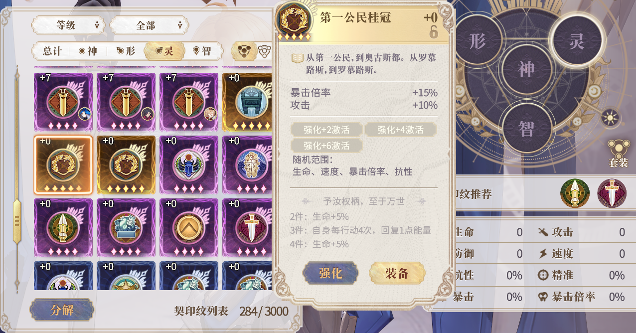 首先我们先来了解契印纹套装种类,现版本契总共有18种套装效果,每种套装的激活效果各不相同,所有套装2件套和4件套的激活效果相同,都是百分比的属性加成,3件套的效果是一个被动效果,很重要,所以一般情况下我们在搭配契印纹时,凑足3件套的被动效果是必须达成的。智、灵、形3个位置的契印纹只属于唯一一种套装,而神之位则属于两种套装属性,有这一机制在,我们4个位置也能凑齐3+2套装的搭配,这也是搭配契印纹中最常见的搭配方式,当然凑齐4件套属性也是不错的选择。