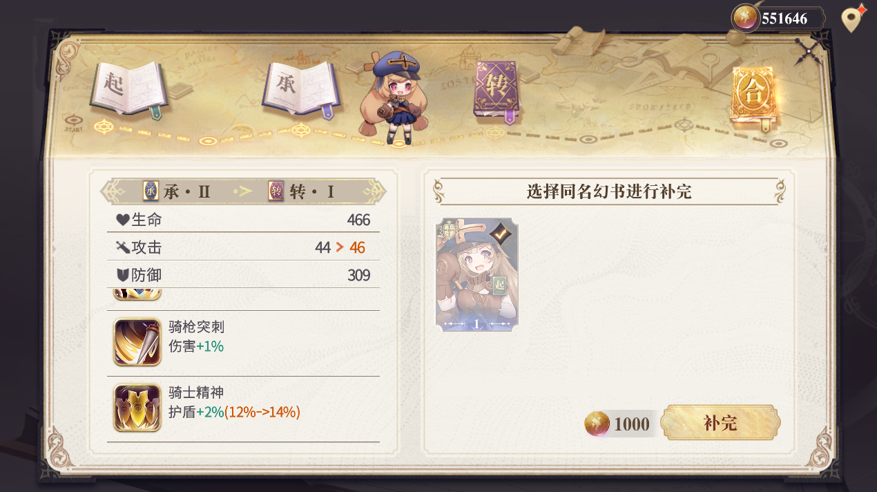 补完幻书可以强化幻书的基础属性,并且在补完达到起、承、转、合任意大等级时强化幻书技能的加成,是提升幻书战力的重要手段。在幻书补完时可以查看消耗的资源与提升的属性,稀有度越高的幻书,强化消耗的古币就越多。