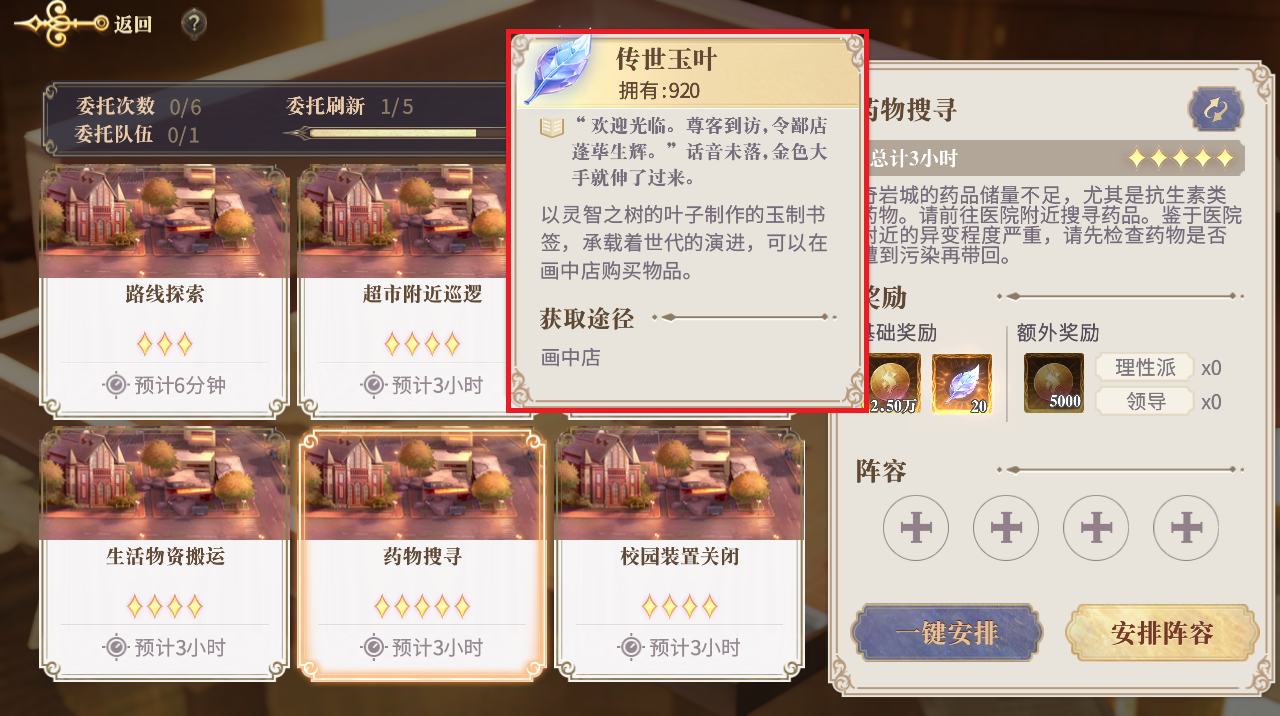 关于委托任务的选择,我们主要依靠委托奖励来区分。首先五星稀有度的传世玉叶以及波特币奖励不论前中后期都非常有用,因此优先级是最高的。