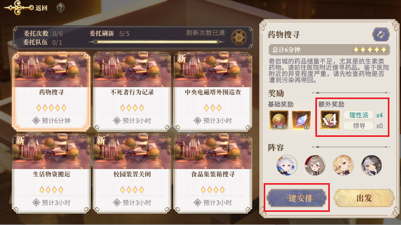 优先做传世玉叶委托和波特币奖励的委托,并且优先通过“一键安排”功能选择幻书,其次根据游戏进度选择奖励来做委托,把暂时不需要的委托刷新掉。