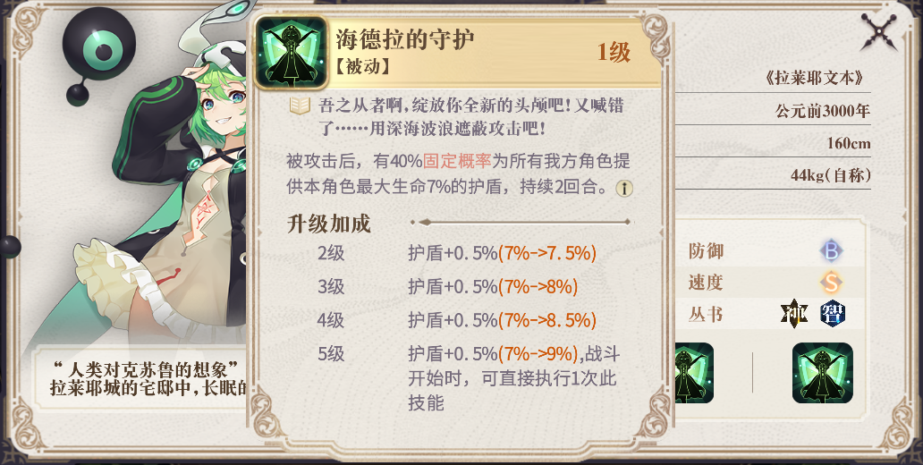 《拉莱耶文本》拉莱耶的被动技“海拉德的守护”,是一个非常强大的技能,这个技能让她在攻击或被攻击后都有概率给全体幻书提供护盾加持,虽然加成不高,但是顶不住频率高呀,如果每个回合都能触发护盾,就能极大地提高幻书的生存能力。在满级之后能提供9%生命值的护盾,并在战斗开始时就直接挂盾。因此拉莱耶最好的站位就是前排承受伤害。