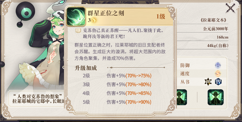 《拉莱耶文本》拉莱耶拥有独特的聚怪技能,大招可以大范围聚怪,而被动技能有几率为我方角色提供护盾,增强团队的存活能力。在前期除了抽卡以外,还可以通过首充活动获取,作为一个控场聚怪的幻书特别好用。