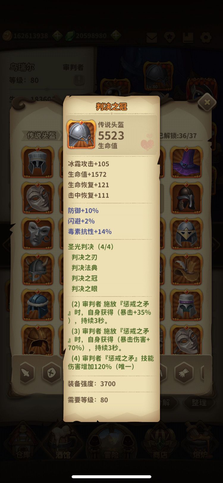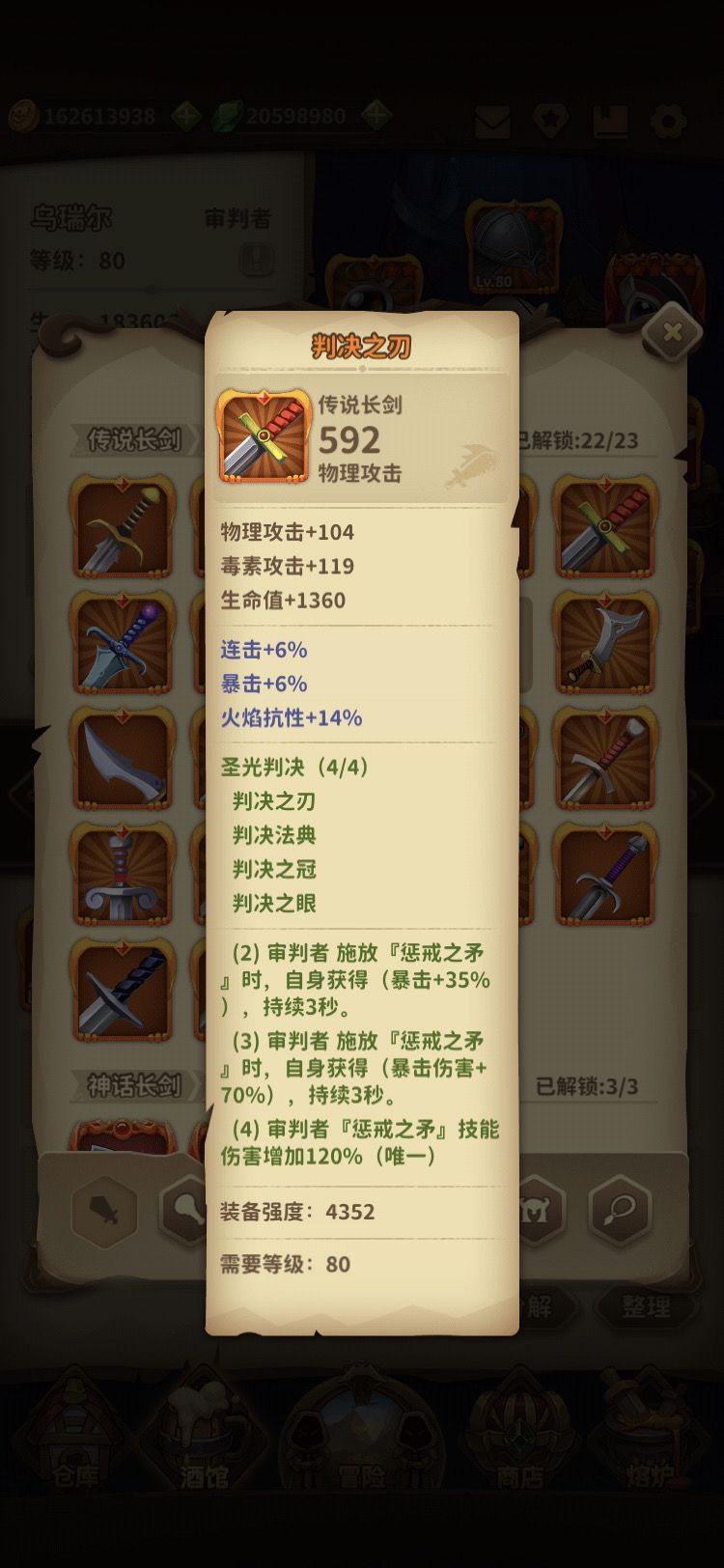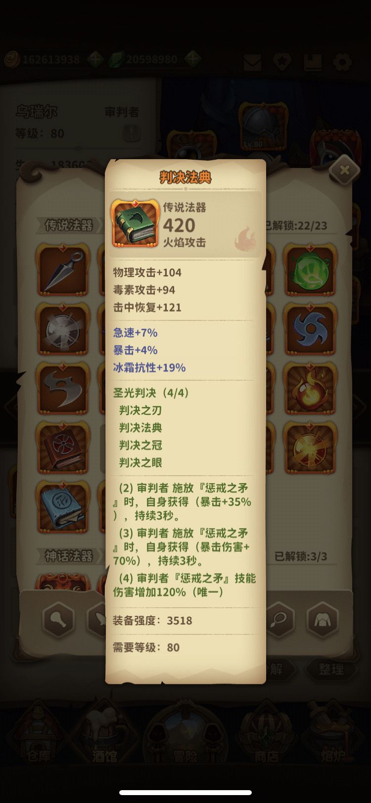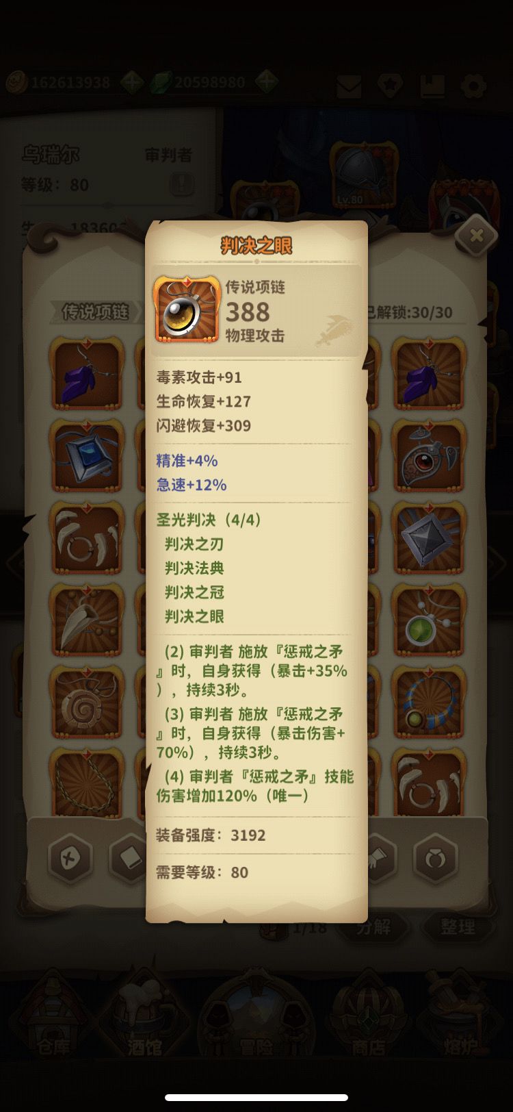 核心装备:判决套装 !头部,项链,法器,武器 四件套。
