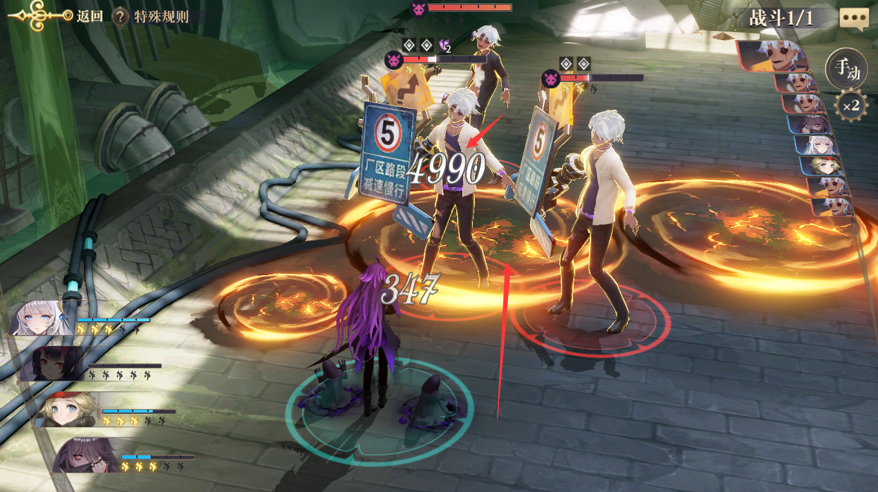 有些战场会有特殊地形,比如上图的火圈,会对站在其上的任何单位造成巨额伤害,馆长们只需要充分利用此类特殊技能,就能轻松取得胜利。但需要注意的一点是,特殊地形不分敌我,对我方也会造成超高的伤害。在对付敌方的同时,也要注意远离这样的特殊地形,特别是在敌方拥有强制位移技能时,提前做好躲避走位,才不会阴沟里翻船。