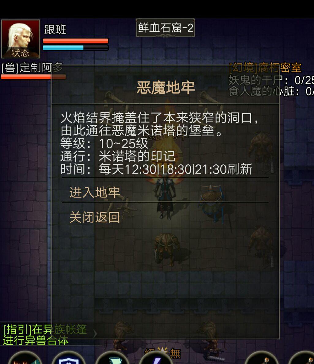 地牢是套装的主要来源,每天12点30,18点30,21点30三次boss刷新,地牢小怪和boss都有几率掉套装,不过介于boss一天才3次,所以还是小号挂机比较好。地牢每天也有一次免门票的机会,这里门票没有了就不展示了,和幻境一样也可以传送到门口。