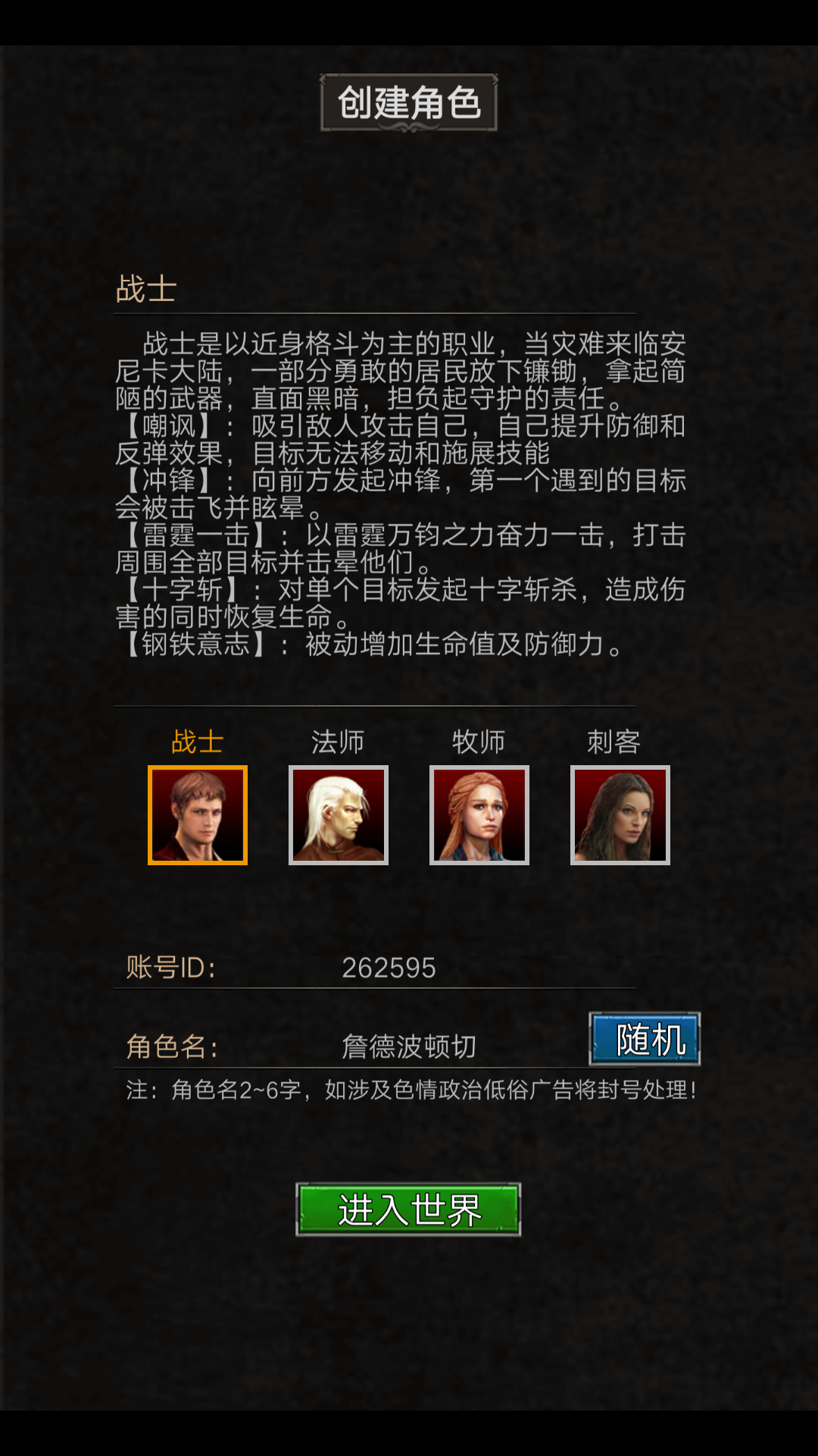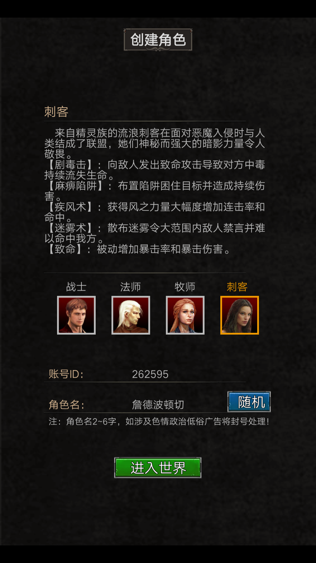 确定好职业和名字,我们点击进去世界开始我们的游戏之旅。