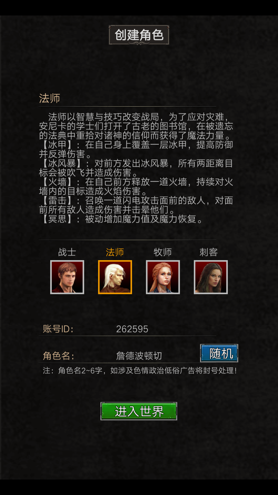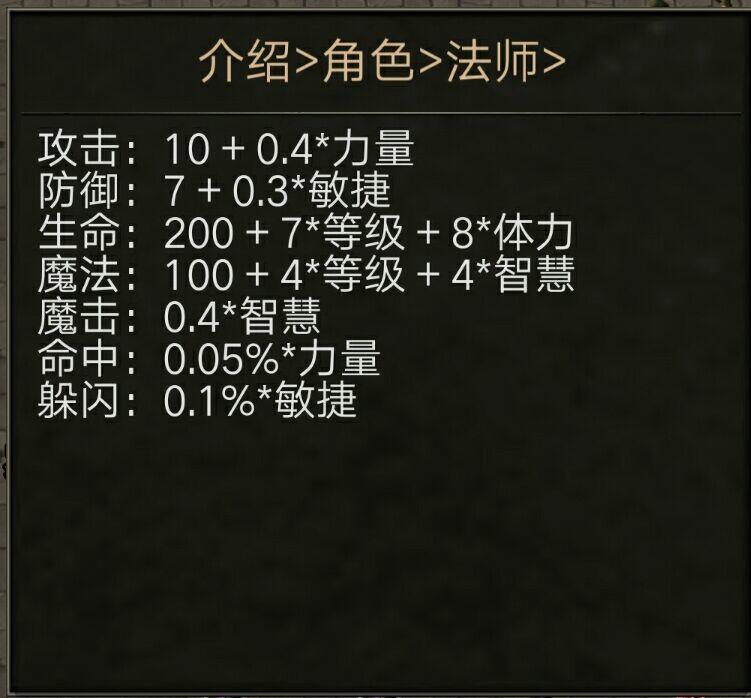 战士定位是抗怪、控制,法师定位是魔法输出,刺客定位是物理爆发,牧师定位是增益援助。怎么样,想好自己玩什么职业了么。因为我个人比较喜欢法师,所以我选择的是法师。下面是法师的属性公式: