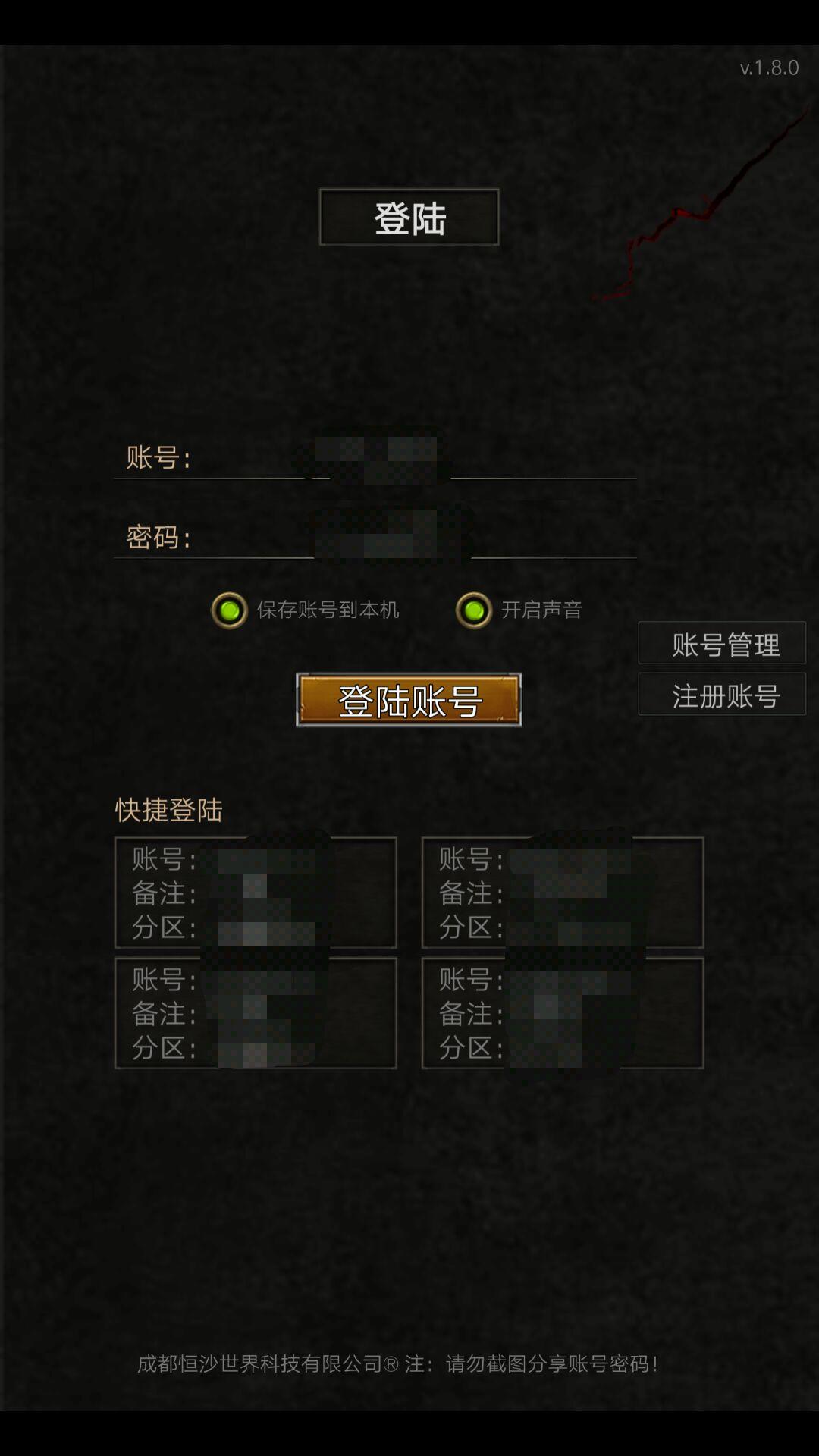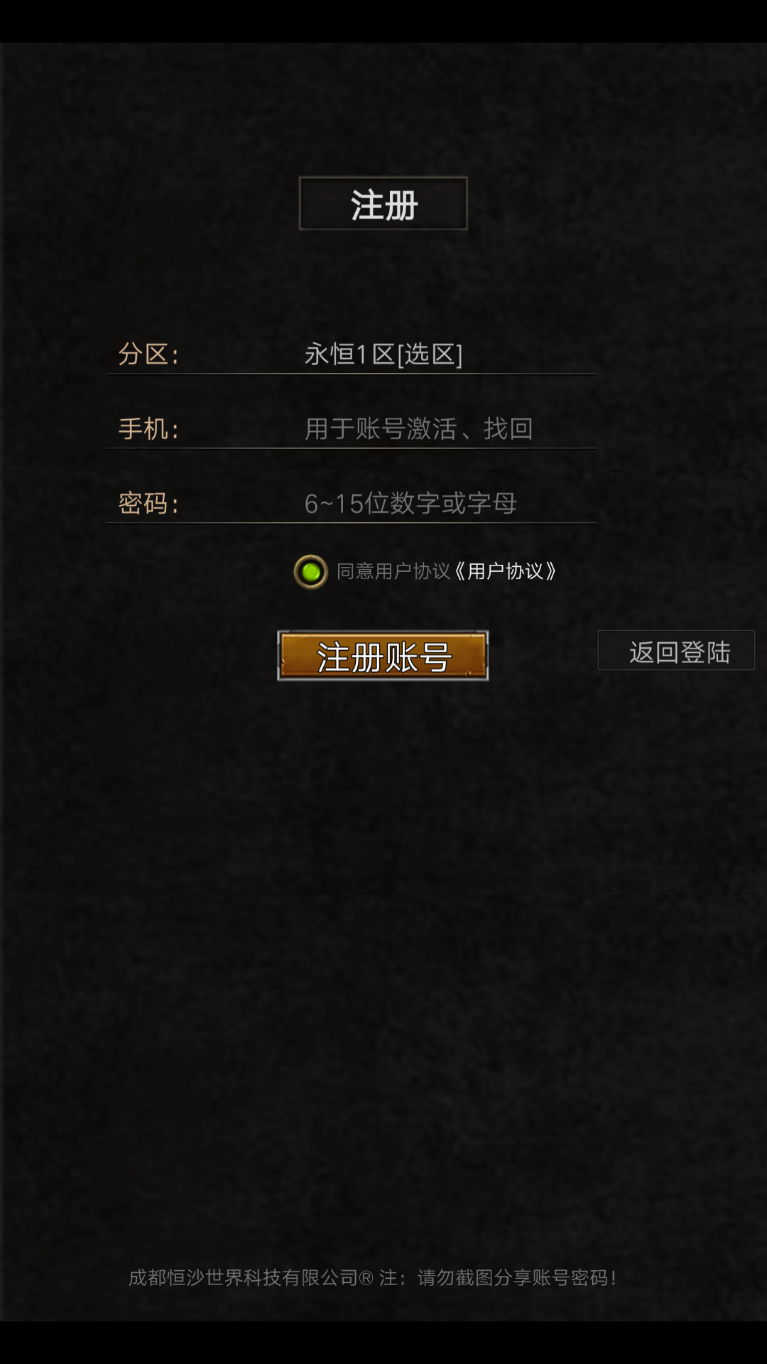 进入登录界面右手边是我们注册账号的地方点击它,我们进入注测界面。这里我们需要注测这里是不用填账号(自动生成)的,还有手机号非常重要用于账号的激活、找回、修改密码等操作,所以要保证自己所填写的手机号可以正常使用(现在一个手机可以注册共5个账号),这里顺便提一下因为是自动生成的账号最好自己在其他地方记录一下,好记性不如烂笔头嘛。账号搞定,点击注册账号(点击注册直接进去角色创建)开始我们的游戏之旅。