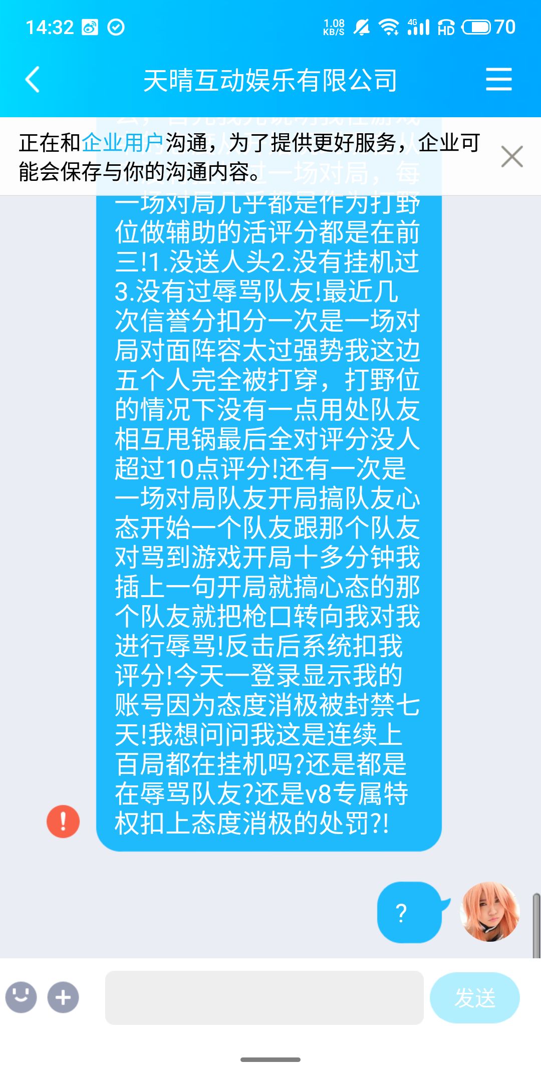 我就纳闷了今天登录游戏给我来个态度消极封号七天?!这是什么特色?这是v8特权还是什么氪金道具?