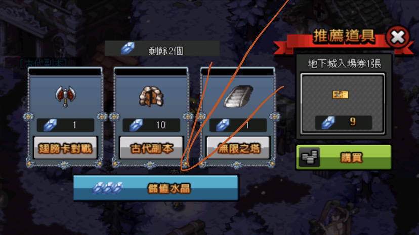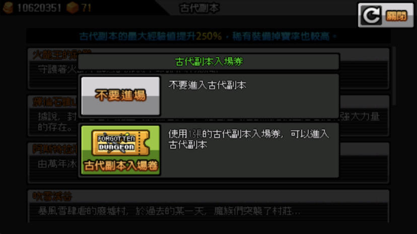 另外地下城入埸卷簡稱(古代卷)穫得方式有每一個禮拜的副本更新時都會送出一些古代卷和最簡單的方法就是直接用焦糖買或用水晶買,但要用水晶買的話又衍生出一個問題就是當你擁有一個或以上的古代卷時直接進入的話會這樣