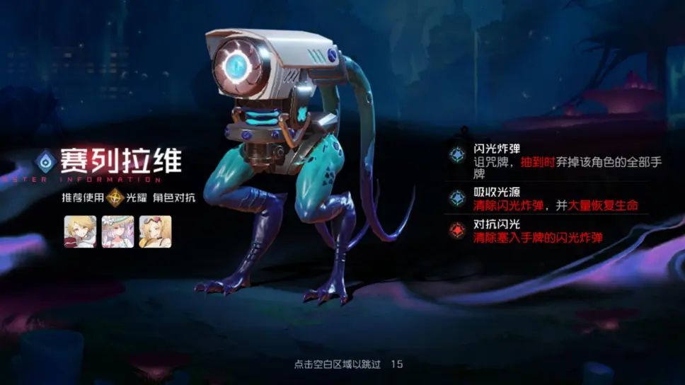 赛列拉维;闪光炸弹:诅咒牌,抽到时弃掉该角色的全部手牌;吸收光源:清除闪光炸弹,并大量恢复生命;