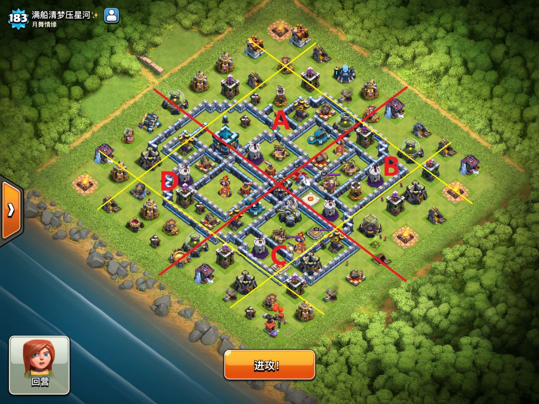 ②第二个打法是以天女作为前戏打掉某一块核心区域,这样的好处是省下攻城机器,可以在后续进攻中灵活选择。示范阵我们以天女打掉D区域为例,如下图所示