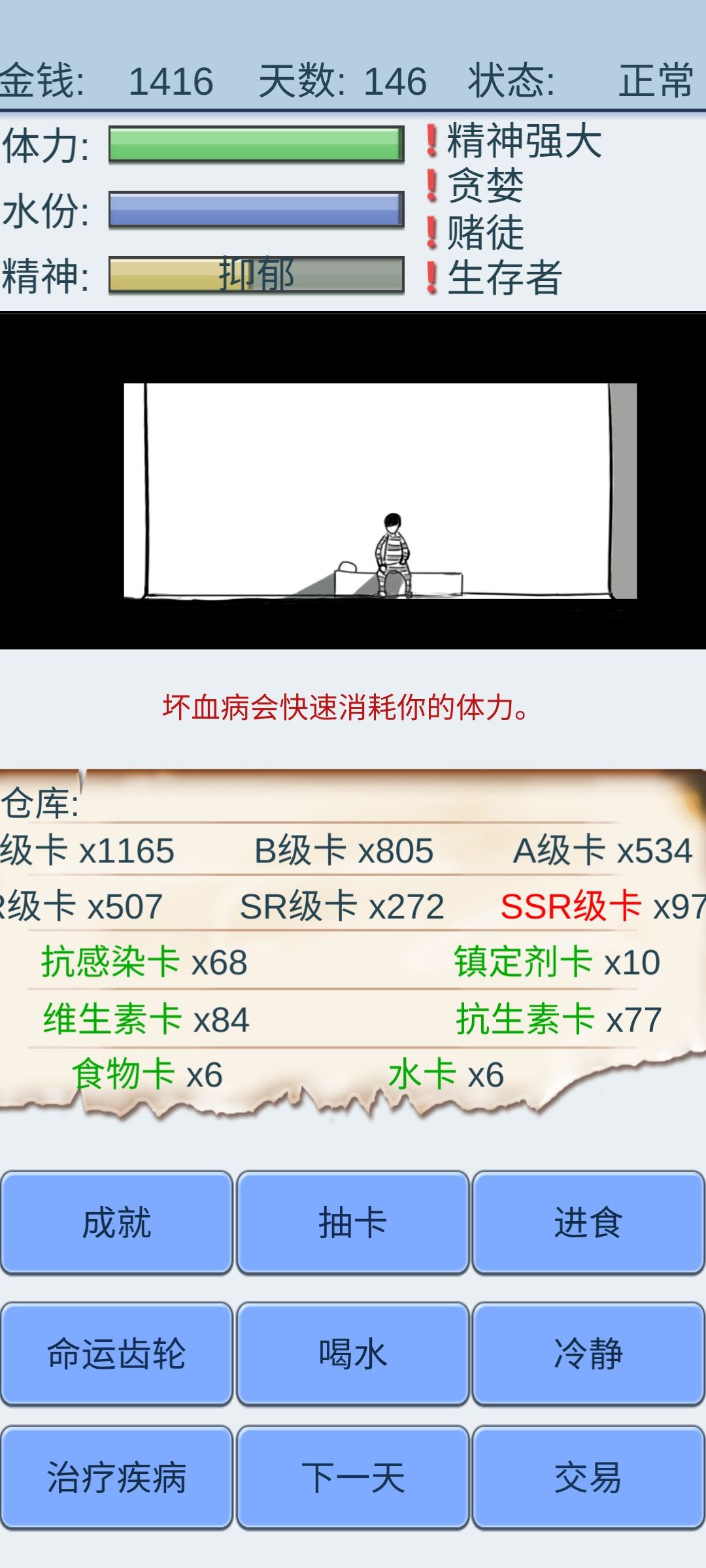在同一天内,获得了50多张ssr,主要还是天赋太好了,我说的是游戏开始的天赋,把水卡和实物卡卖掉,再用那些卡片换东西,轮着来一下就抽到了许多ssr卡,然后就过关了