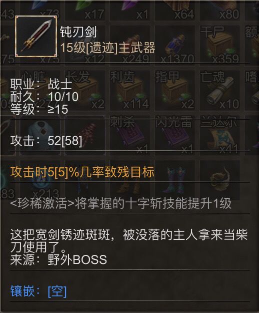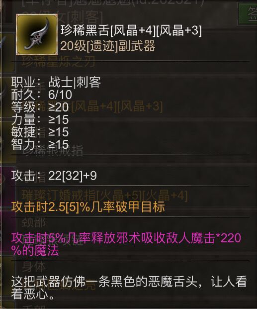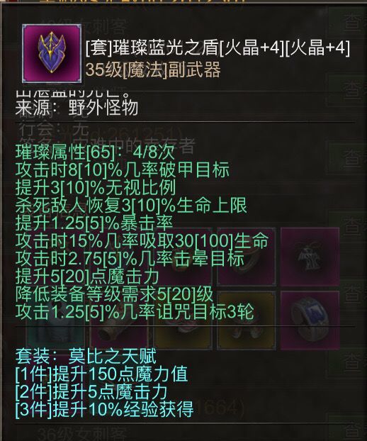 游戏装备分为普通装备、魔法装备、遗迹装备三个级别,普通装备只有固定基础属性,魔法装备拥有固定词条但随机强度的魔法属性以及随机的基础属性,而遗迹装备则拥有更强的魔法属性以及需要凝练等级激活的强大的隐藏属性,三种装备分别从野外、幻境副本、野外BOSS获得。