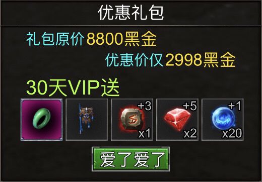 随着游戏的进行,通过指引,主线和成就奖励,将会有不错的新手装,满足你前期开荒需求。这里建议一下,开荒装备不用的时候存起来,后面合成翅膀,或许会用得着。前期记得找圣诞树领礼包,尤其是经验卡,是你升级必不可少的。当然,当你黑金充足的时候,可以把新手礼包买了,性价比还是很高的。如下