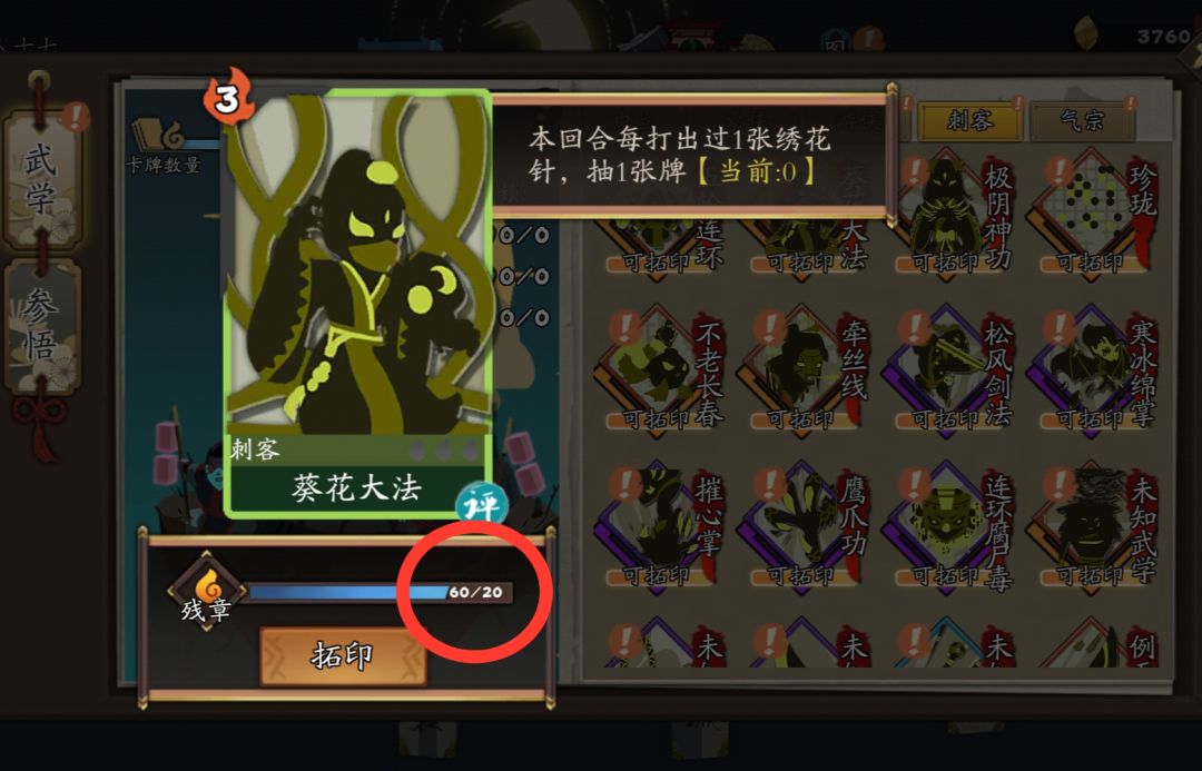武学喂不关键的橙卡武学(没拓印保留20张武学残章);