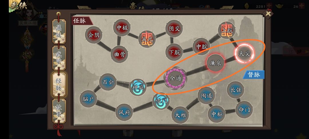经脉对阵容强度的提升高于神兵符文,考虑到前期药材的获取速度满足不了需求,建议经脉挑重要的点,且前期绝不考虑全通。(如下图,红色上脘为武学满星,蓝色神庭为技能满级,圈内三个经脉的药材消耗能达到整张经脉图的40%)