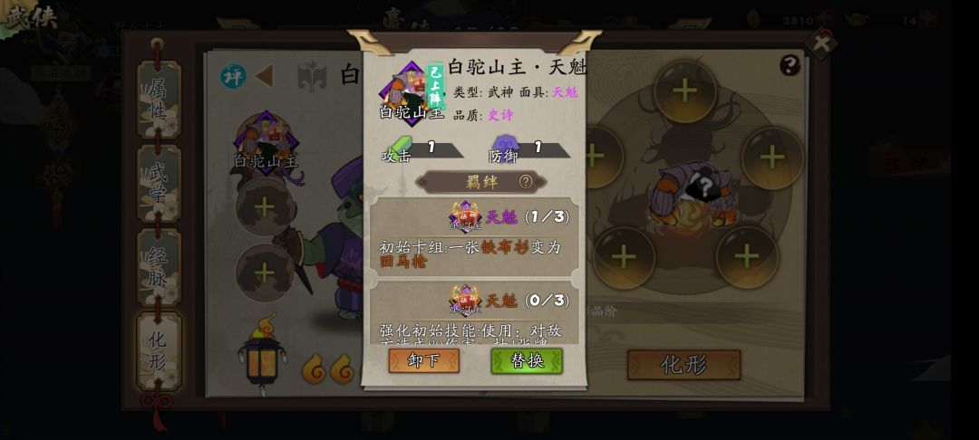 一套5个同品质化形材料做一个化形,每个化形提供基础面板属性,三个同名(后缀)化形产生羁绊效果,不一定要同一个武侠;