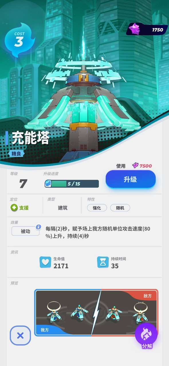 【充能塔】在使用该卡牌后,每隔2秒,赋予场上我方随机单位攻击速度上升的特性,持续4秒;该卡牌在战场上存在的时间为35秒。