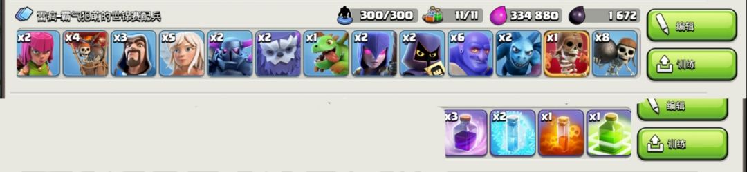 援军:2雪怪1武神1野蛮人,狂暴,攻城器械最好一样一个(主要是飞艇训练营和车,大气球偶尔用来压缩阵型)。