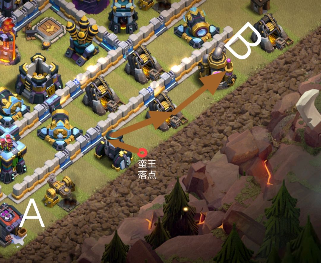 如果有一排建筑,互相间距相同,两端记为A,B,你想蛮王从中间出发,最终往B点清边,那么蛮王应该下在两个建筑之间偏A端的地方。