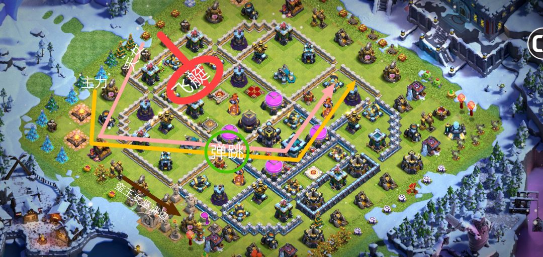 O型路线(适合回字阵,五岛阵):这个路线与U型路线很相似,区别在于L型路线大本在路线上,O型一般大本不在路线上,例如一些回字阵。用飞艇或者车来爆本,大部队绕圈。