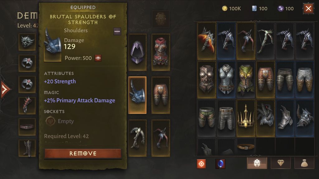 理念:物品是《暗黑破坏神》中最关键的部分之一。《暗黑破坏神:不朽》的物品应当不断为玩家提供提升力量的机会。玩家可以升级物品来解锁潜力,或者用更好的装备升级换代。属性加成物品可以让你的角色在战斗的某些方面更为高效。
