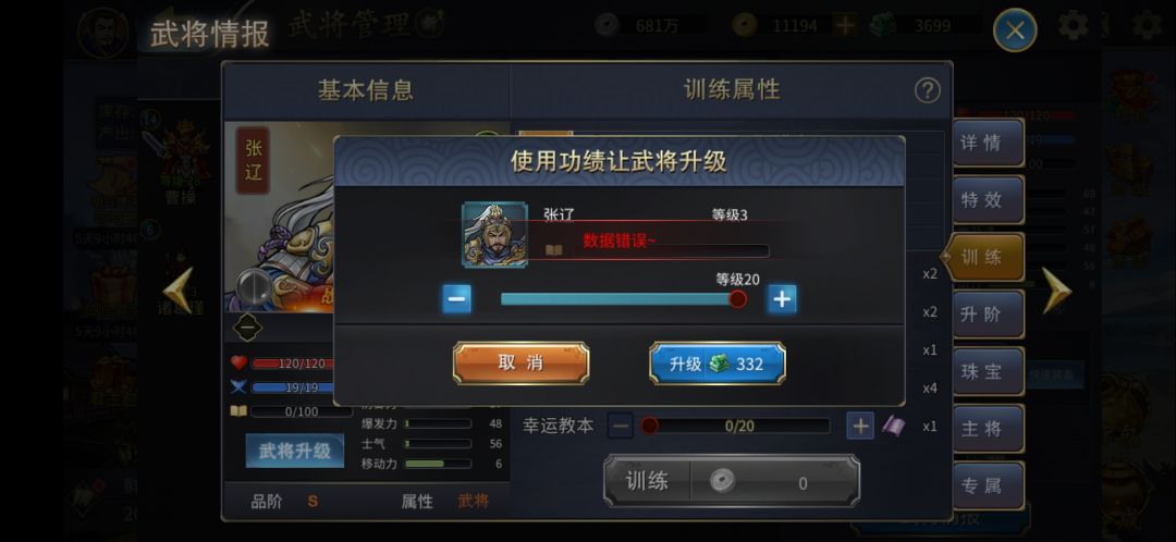 用功绩给张辽升级 提示数据错误