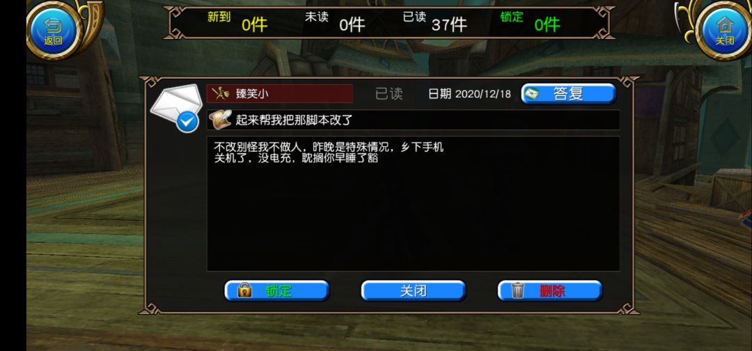 先开始,我找他4锁,然后啥原因没讲秒下线图中时间为21:47,我当时以为他网不好,我等了半小时,还是没回来,然后我感觉自己被骗了,我就在世界喊,这人是4锁骗子,拿了东西秒下线。我喊了挺久的,然后我找个人帮忙挂下骗子,就这样挂了一个晚上,我也一直在等他上线
