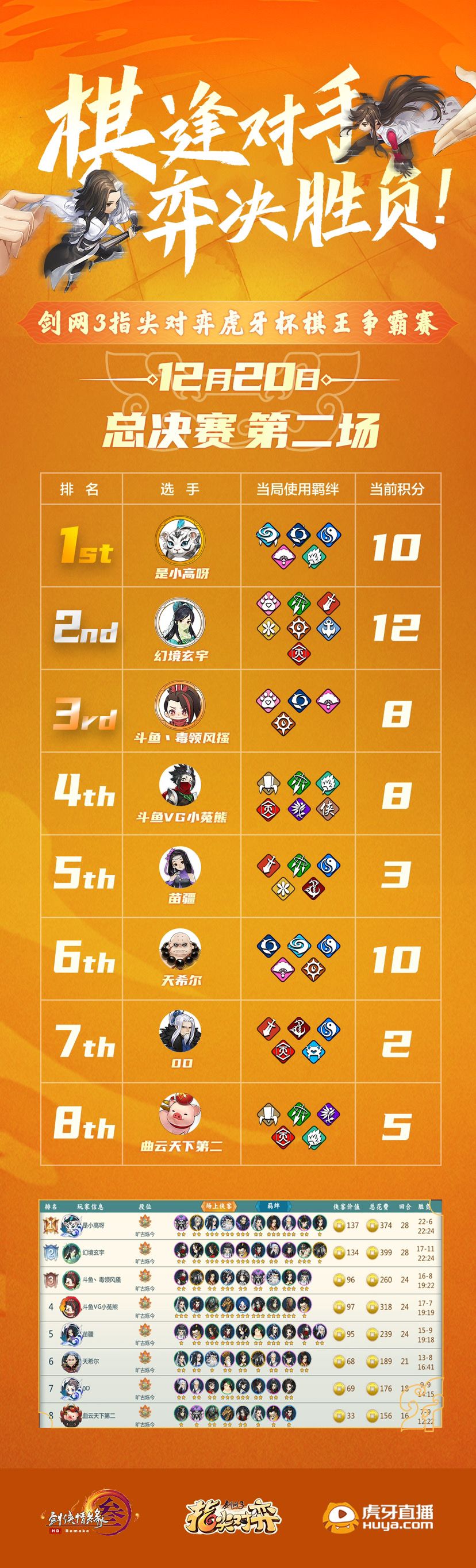 选手排名:【是小高呀】、【幻境玄宇】、【斗鱼丶毒领风搔】、【斗鱼VG小菟熊】、【苗疆】、【天希尔】、【0O】、【曲云天下第二】