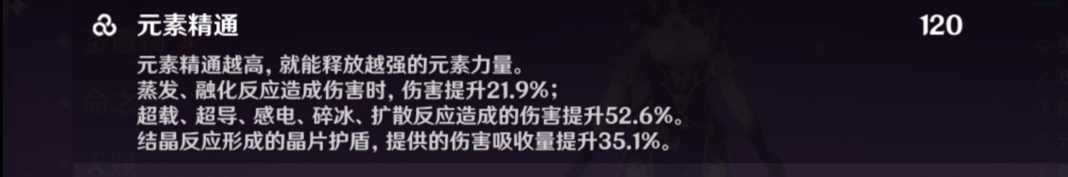 120元素精通增益效果如图,班尼特大招时存留的火阵,雷泽开大平A刀刀超载,行秋副C打蒸发也一样提升伤害。而且在冒险等级35级之前辅助也就教官套能增加些伤害。