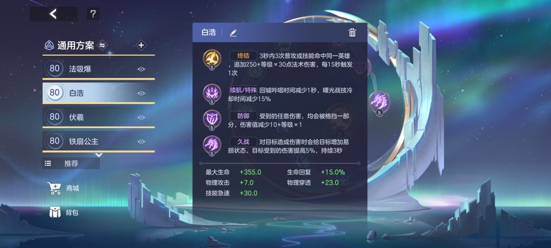 装备四:正义壁垒 增加物理防御,减少收到普攻的伤害(目前版本强势英雄大多数是刺客,战士,所以先出物抗)提高生命值 提高坦度 提高大招回复能力(大招回复3%最大生命)被动正义 累计收到20%最大生命值后,会充能,碰到敌方英雄会释放冲击波 造成伤害(aoe伤害)还能降低敌方目标的25%攻击力和25%暴击伤害,打团利器,这件装备可以极大得提高伏羲的生存能力,提高白浩的近战输出