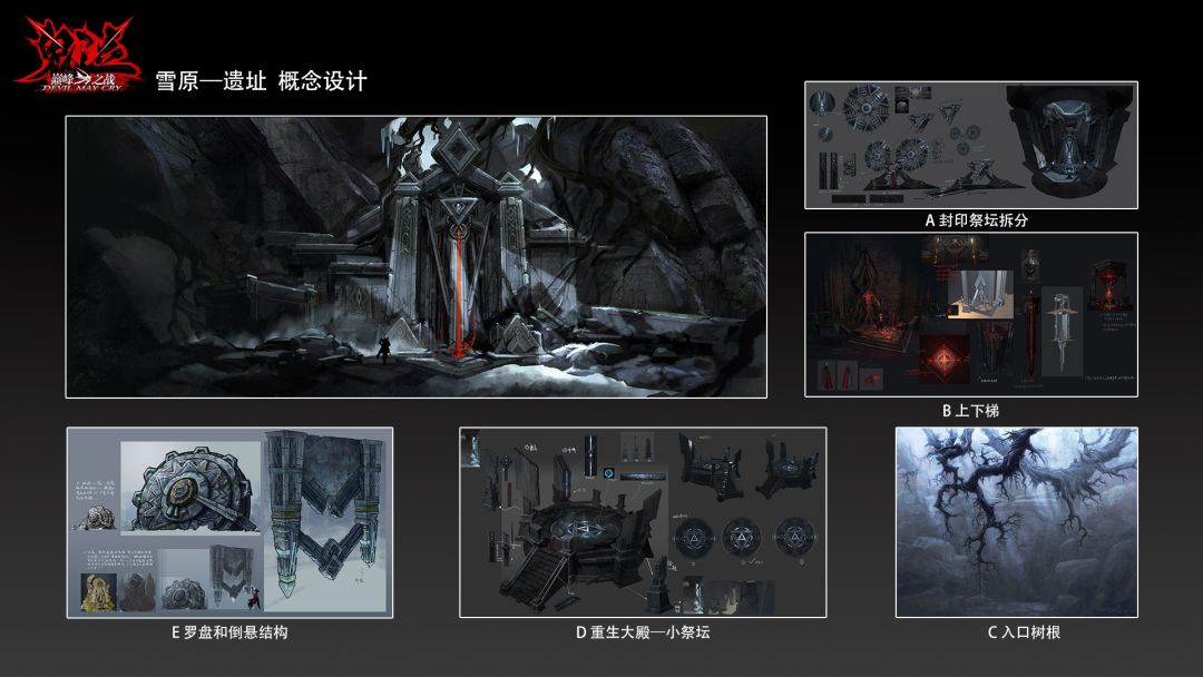 首先来介绍我们的新场景之一,雪原遗址。作为游戏中最应具“破败“意味的建筑,设计师的设定将本场景在时间与空间上的特点极大程度地表达了出来。时间上,在但丁继续深查委托的途中,遭遇了来自更为强大的恶魔的挑战。因此在本场景内,所有的事物都充满神秘这一特点:入口处似乎是故意挡住去路的虬实树根,充满诡异的神殿,被未知人物封印的大小祭坛,都无一不在表现着时间上的沧桑,时刻表达的着“破败”这一建筑主题,也以此衬托出即将登场于主场景之内怪物的恐怖实力。而在整体的空间布局上,各种元素,包括罗盘,倒悬结构等充满哥特风格的细节建筑,都做到了时代与空间相统一,使人、事、物在剧情推进的过程中相当契合。因此,我们可以看到整个《鬼泣-巅峰之战》在建筑美术风格上不仅是以哥特风格点缀,更汲取《鬼泣》原作中的城堡,特米尼格塔以及现实废墟图解等设计元素来强化魔幻主义的风格,如此之下,“古典”与“现代”两种毫不相干的元素碰撞在一起,更加具有韵味。以此让玩家们从时间和空间角度感受到丰富立体的《鬼泣》风味。